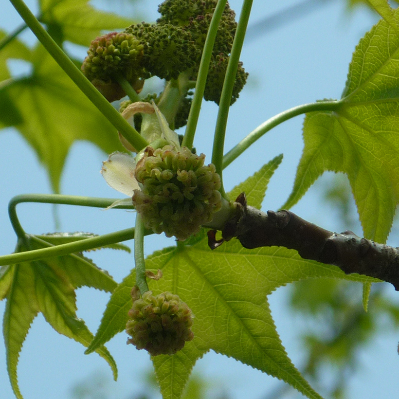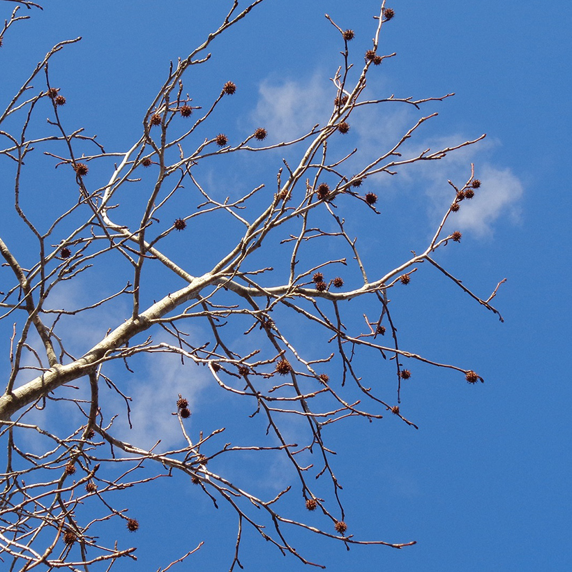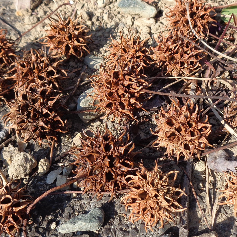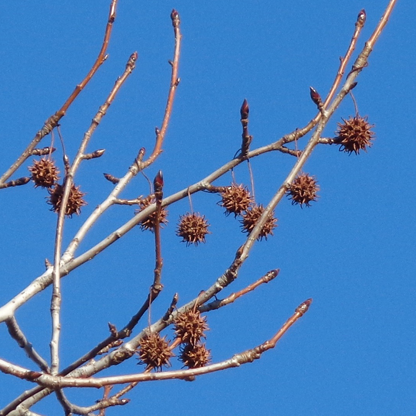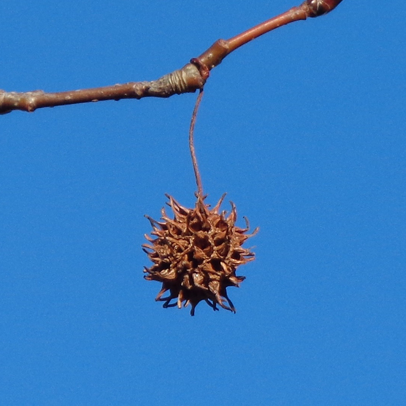 - ①紅葉葉楓(モミジバフウ)の実が、葉の落ちた木にまだぶら下がっています。そして、ふと足元を見るとたくさんの実が転がっているのでビックリです。このイガイガの実はクリスマスリースやクラフトの材料になります。