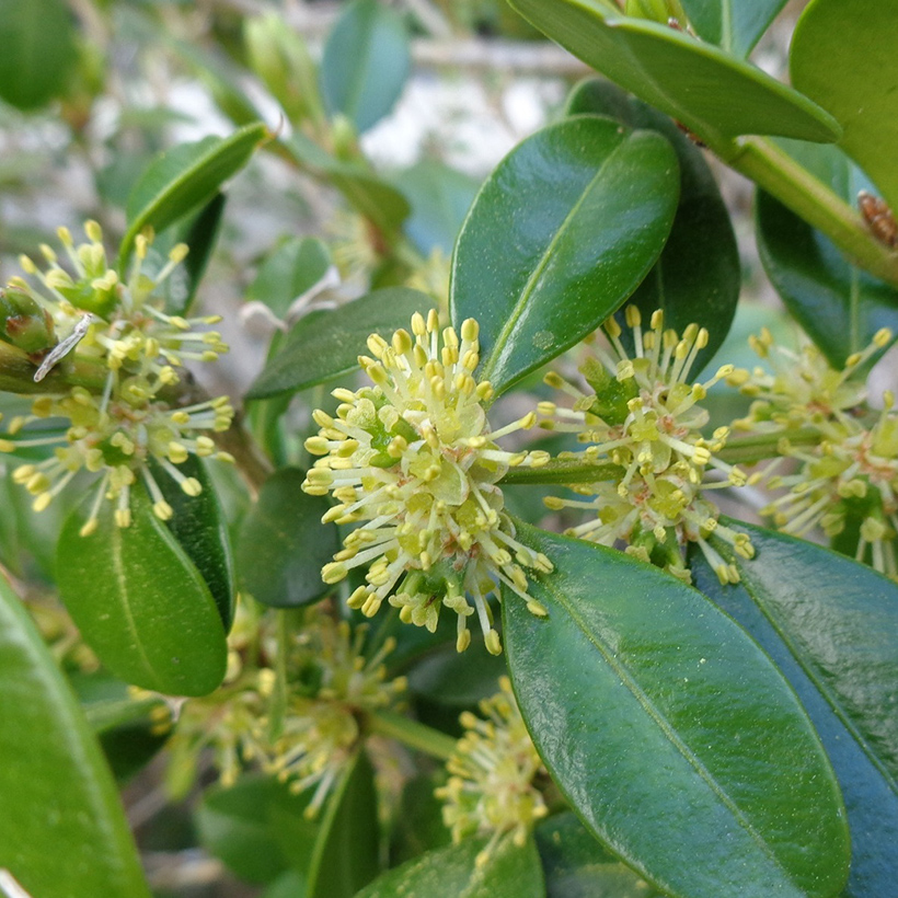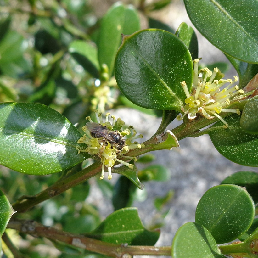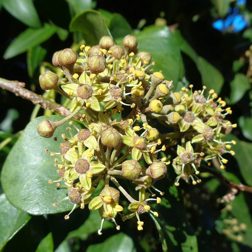 ②柘植(ツゲ)の花が咲いています。地味な花で目立ちませんが芳香を放っておりたくさんの昆虫が集まっています。櫛や彫刻、その他細工に使われる高級材です。