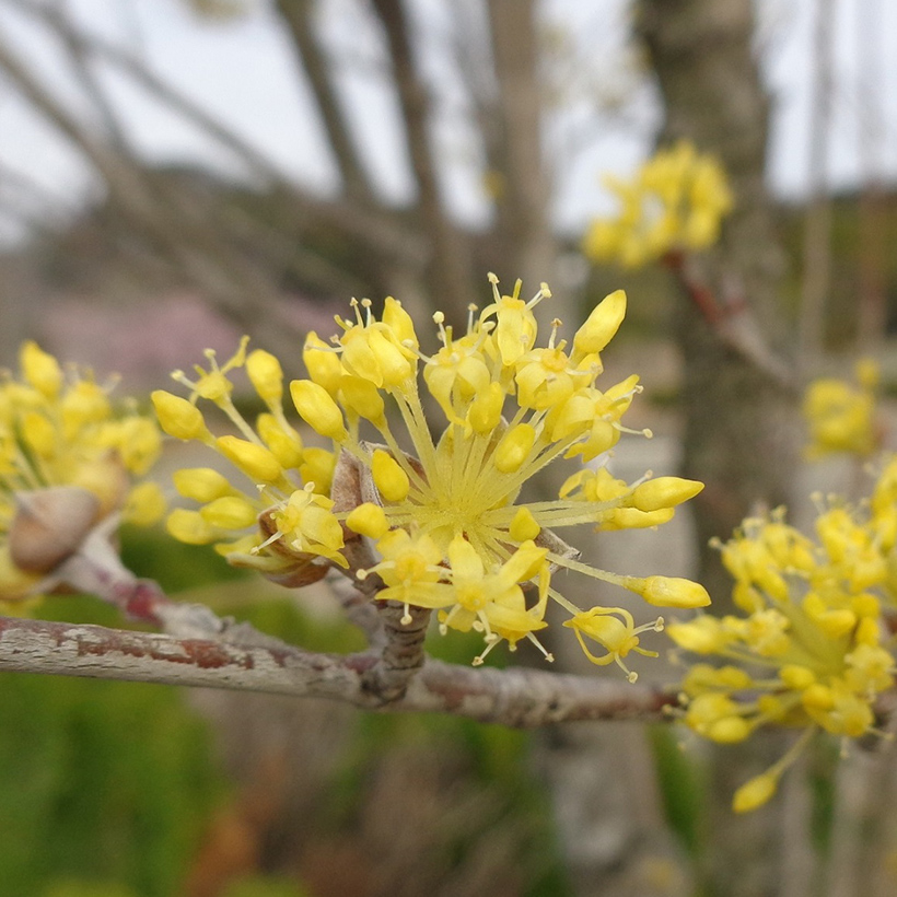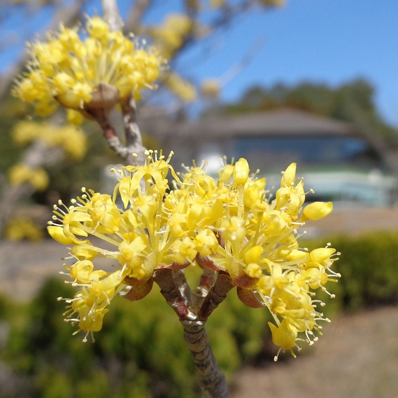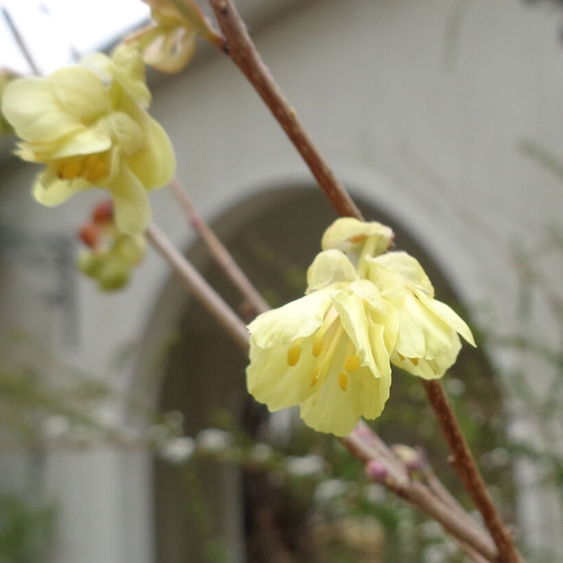 - ①山茱萸(サンシュユ)が咲いています。葉が出る前に黄色の小さな花をたくさんつける早春を代表する花木のひとつです。木全体が早春の光を浴びて黄金色に輝くので別名「春黄金花(ハルコガネ)」とも呼ばれます。