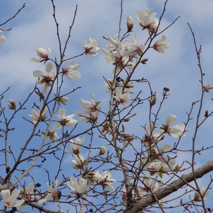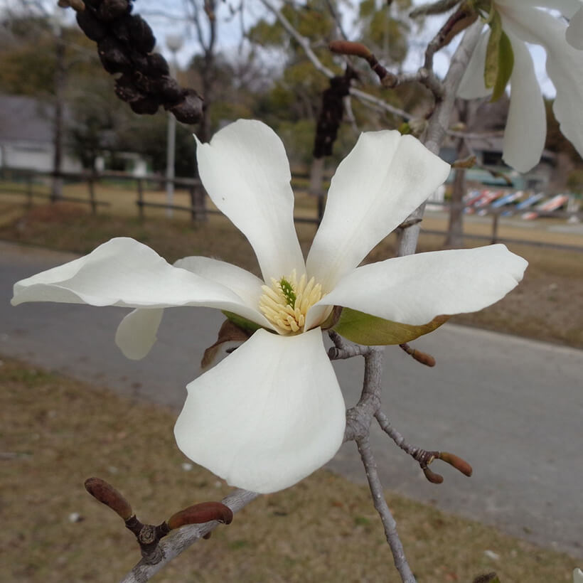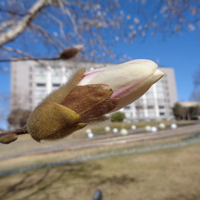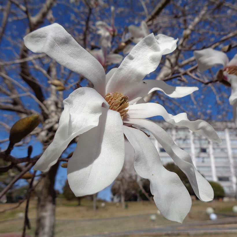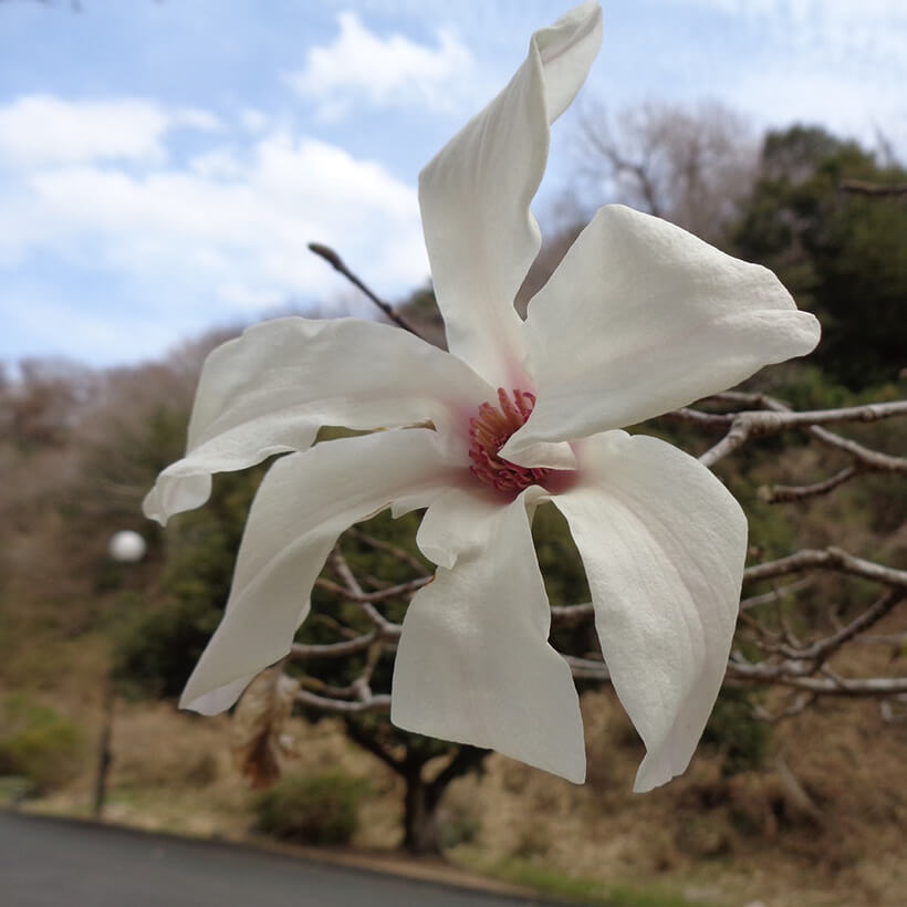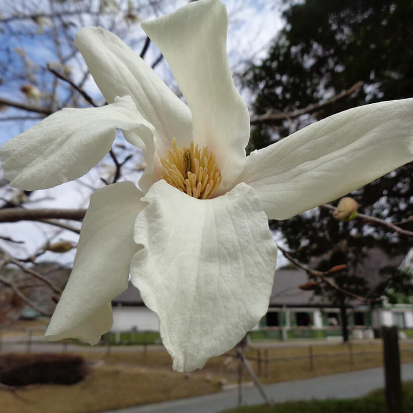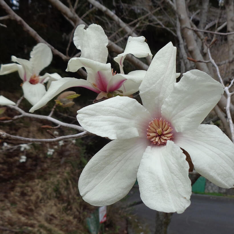②白木蓮(ハクモクレン)が咲いています。辛夷は花が全開しますが、白木蓮は全開しないので見分けがつきます。
