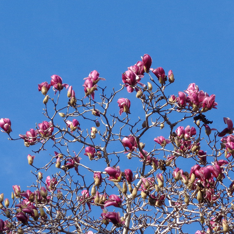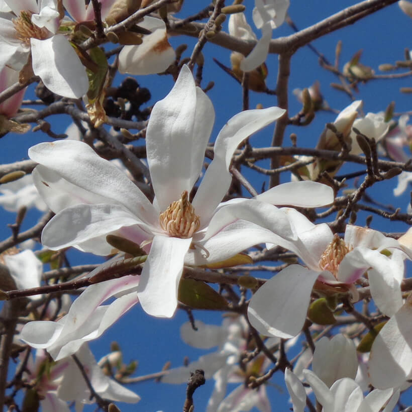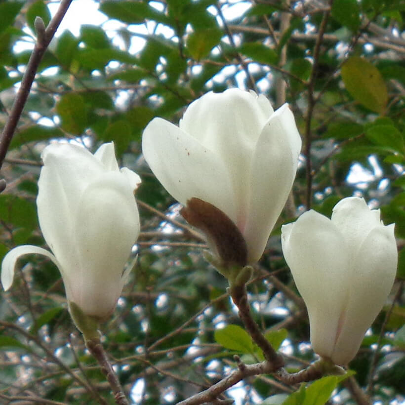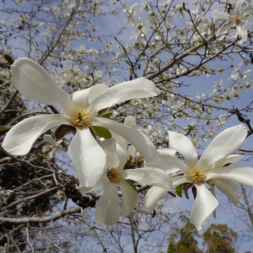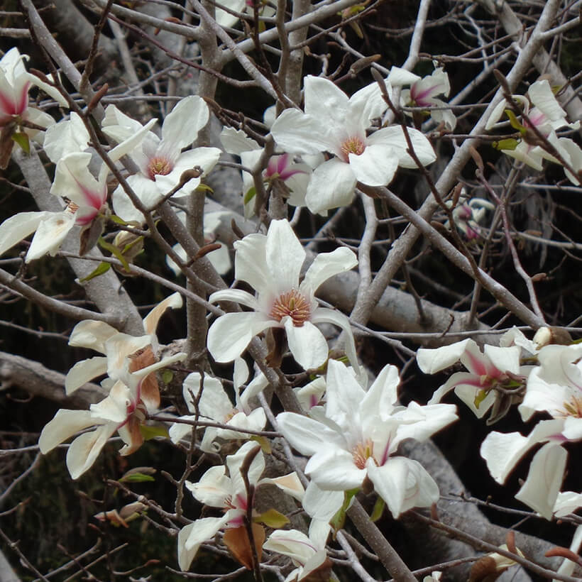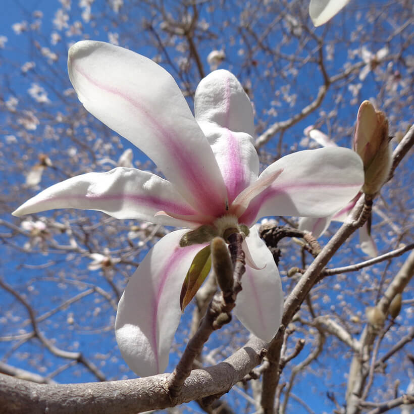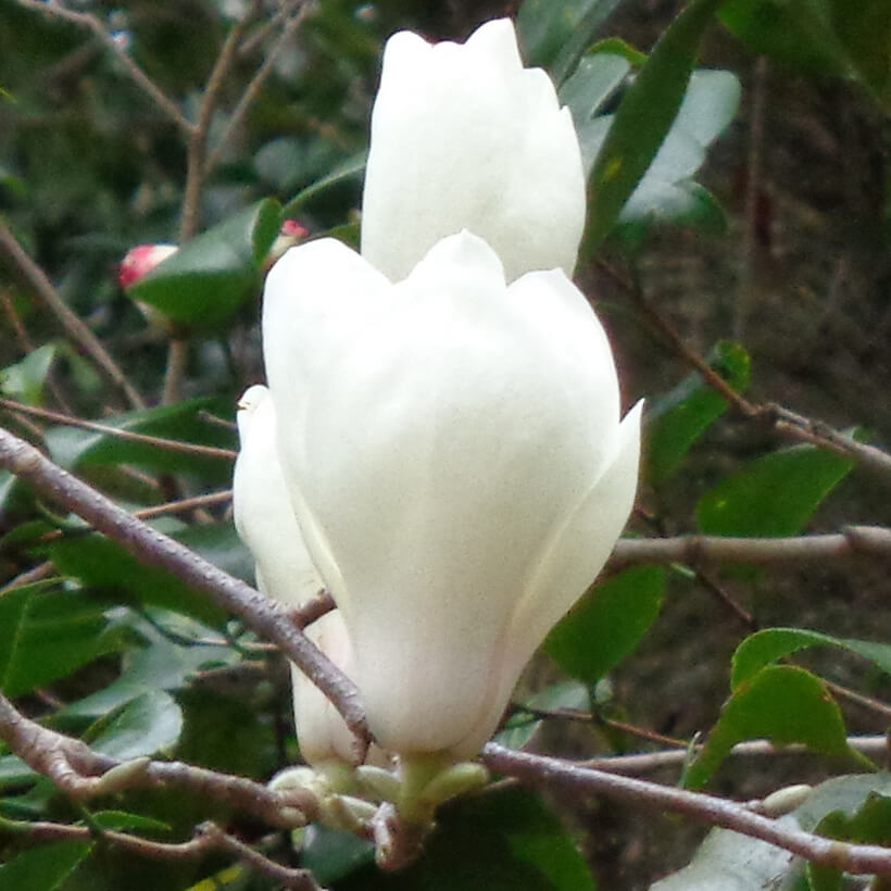 ②白木蓮(ハクモクレン)が咲いています。辛夷は花が全開しますが、白木蓮は全開しないので見分けがつきます。
