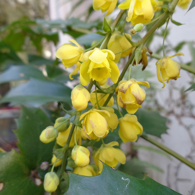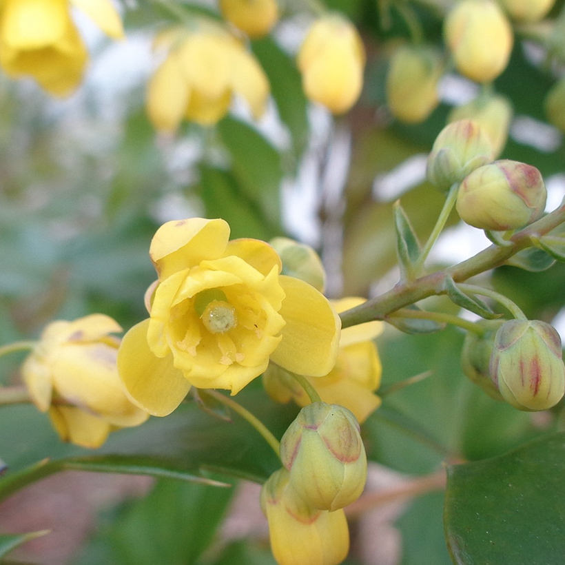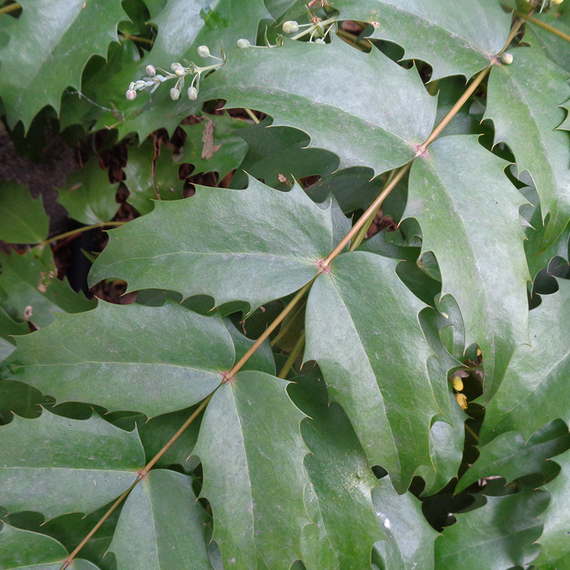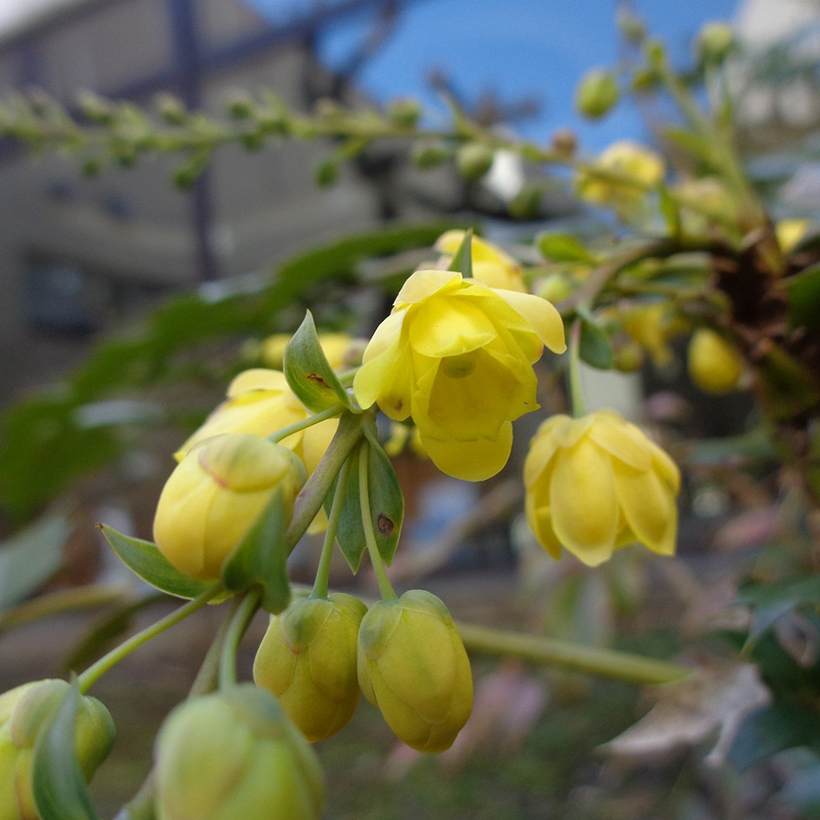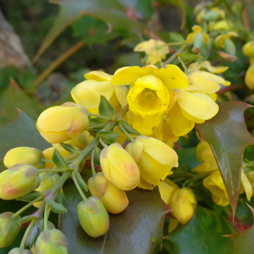 - 柊南天(ヒイラギナンテン)が咲いています。葉の雰囲気が南天に似ていて、葉の縁に柊のようなトゲがあることからこの名がつきました。南天も柊も縁起の良い木であり両方を併せ持つ「柊南天」は更に縁起の良い木ということで広まっています。