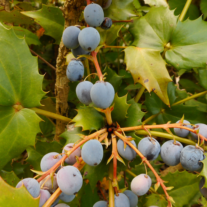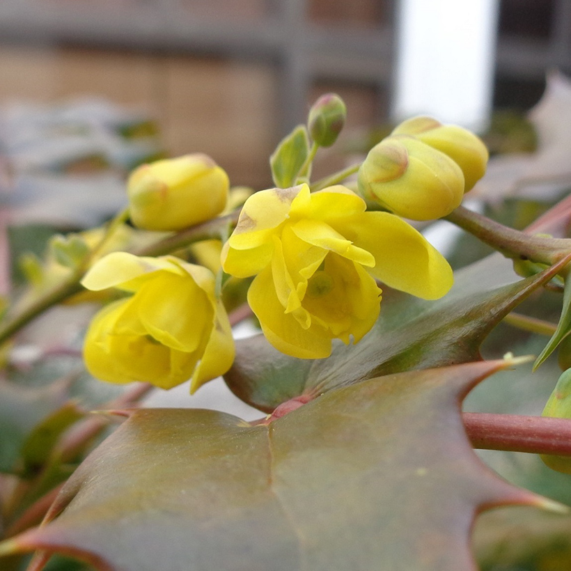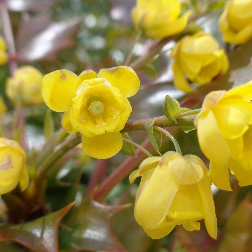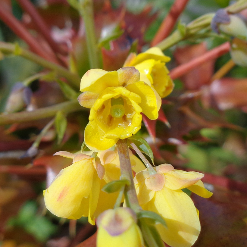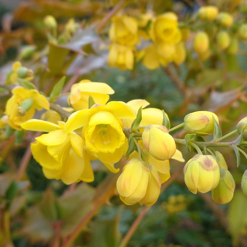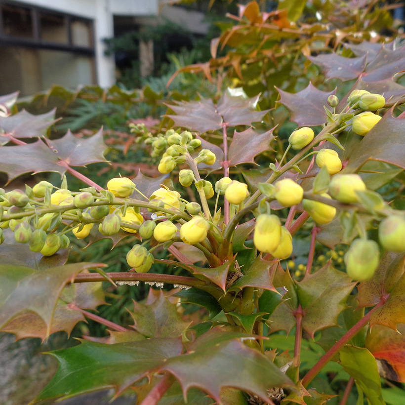 - 柊南天(ヒイラギナンテン)が咲いています。葉の雰囲気が南天に似ていて、葉の縁に柊のようなトゲがあることからこの名がつきました。南天も柊も縁起の良い木であり両方を併せ持つ「柊南天」は更に縁起の良い木ということで広まっています。