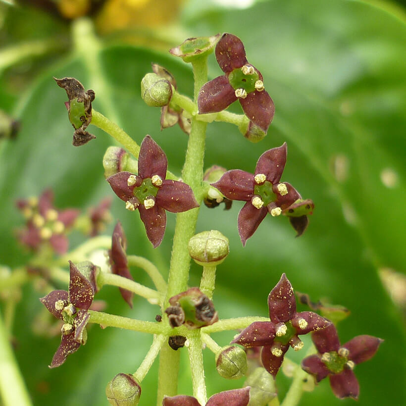 ▲1つの雌花を多くの雄花が囲んで咲く