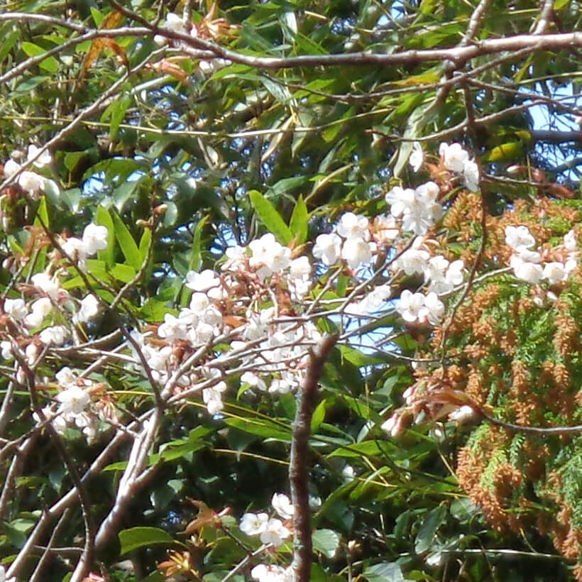 - ①馬酔木(アセビ)が咲いています。壷型の白い花が枝いっぱい連なっています。枝葉に「アセボチン」という有毒成分を含んでおり、馬が食べると脚が萎えて酔ったようになることからこの名がつきました。