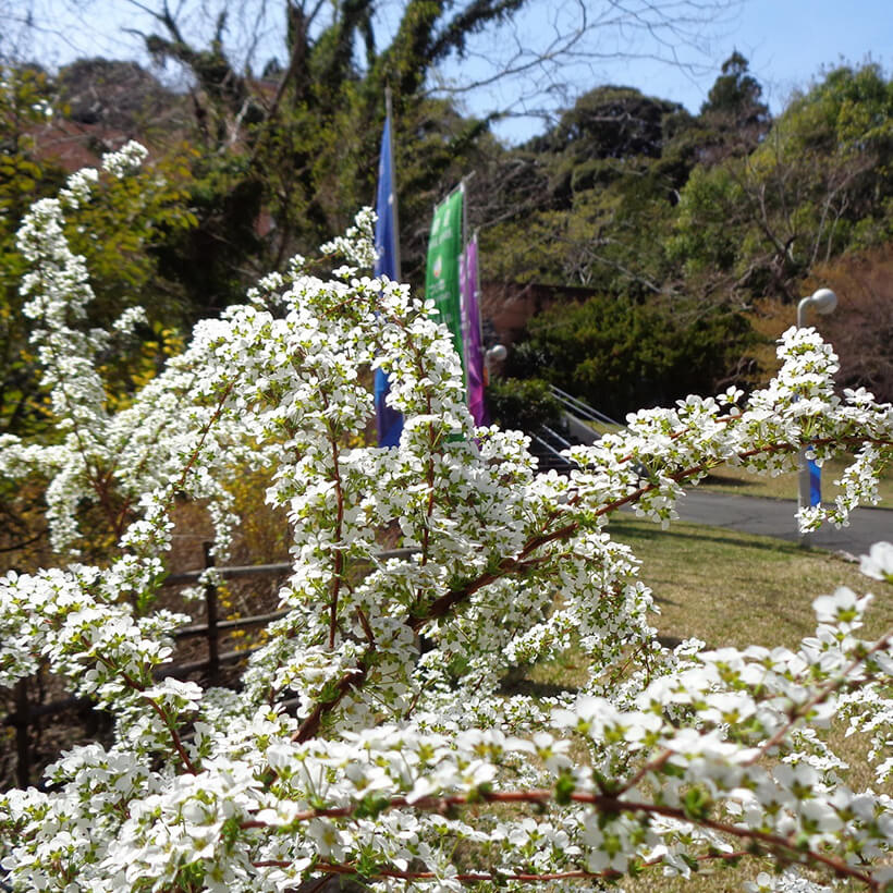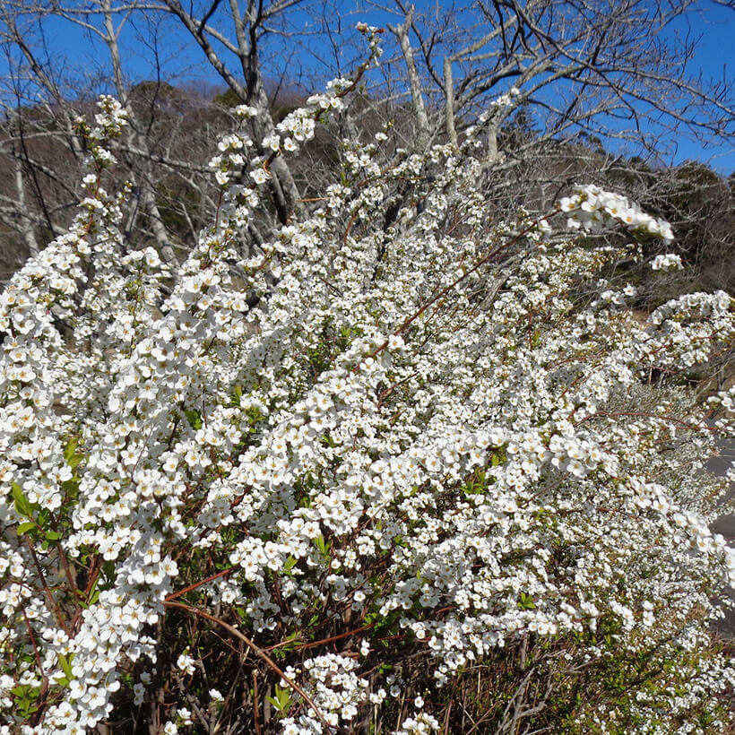 - ①雪柳(ユキヤナギ)が咲いています。葉が柳の葉に似て細長く、枝いっぱいに白い花を雪が積もったように咲かせることからこの名になりました。白い小花を米に見立てて別名「小米花(コゴメバナ)」とも言われます。