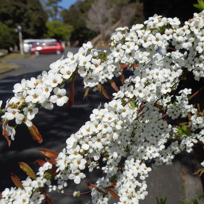 ▲乗馬上三叉路の雪柳