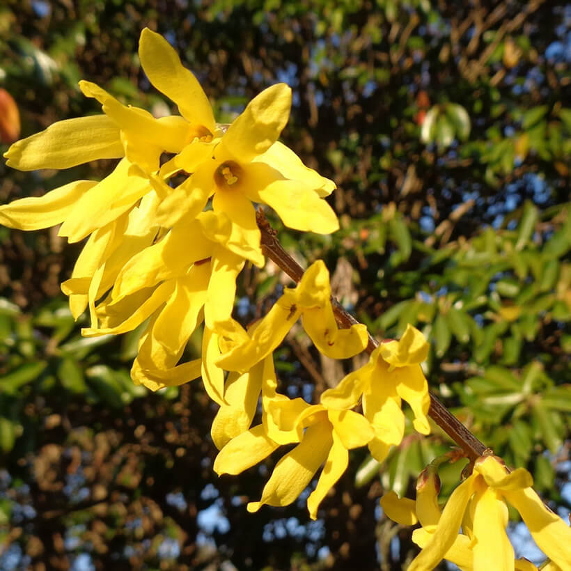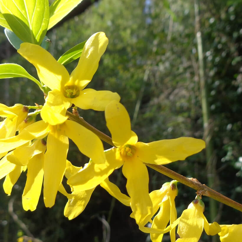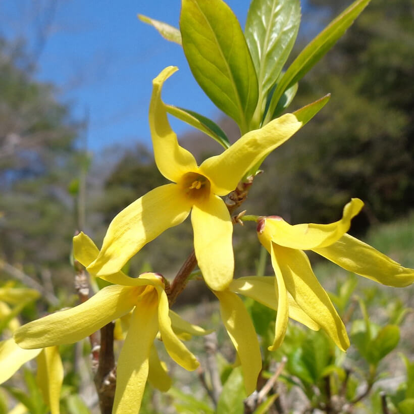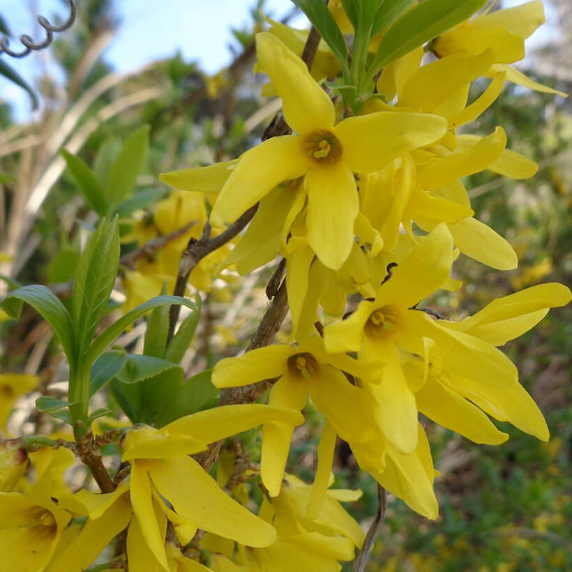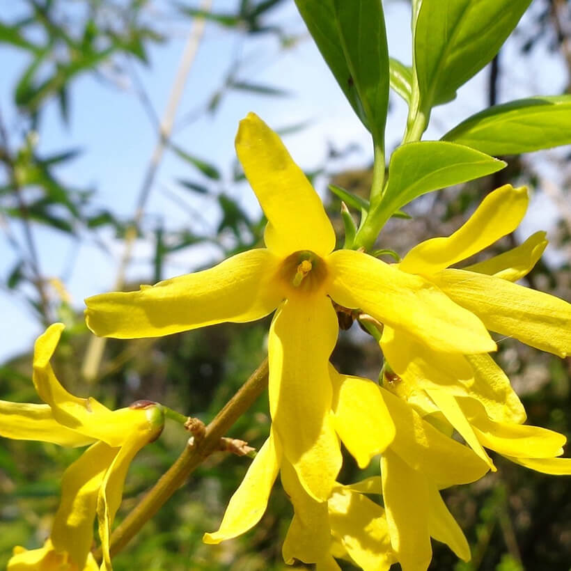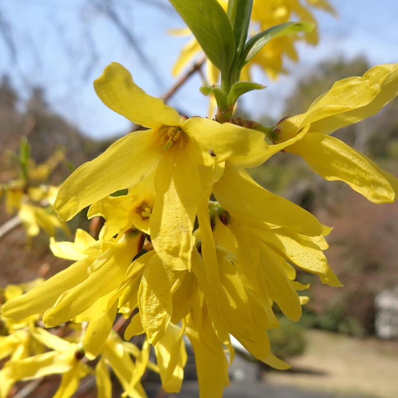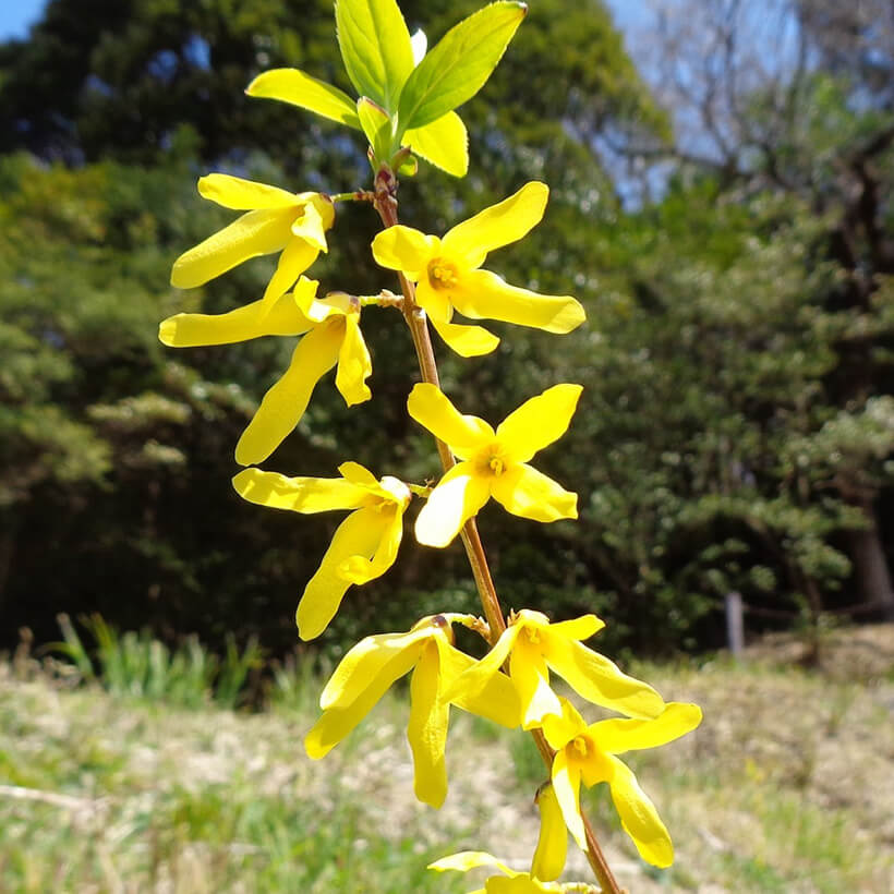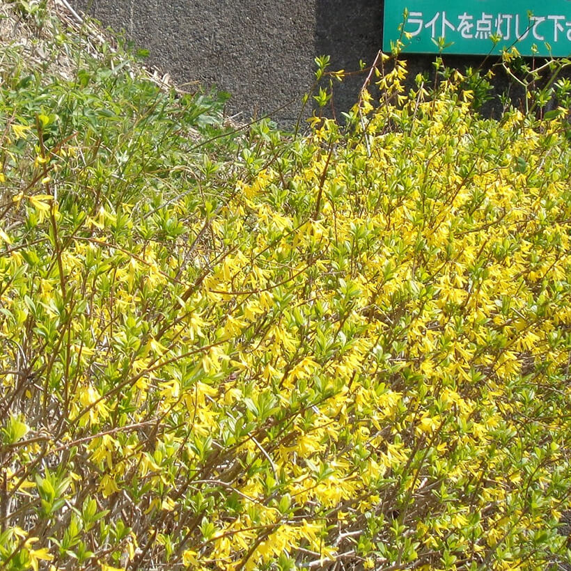 ②連翹(レンギョウ)が咲いています。英語ではゴールデンベルと呼ばれ、その名の通り枝一面に鈴のような黄色い花を鮮やかに咲かせています。