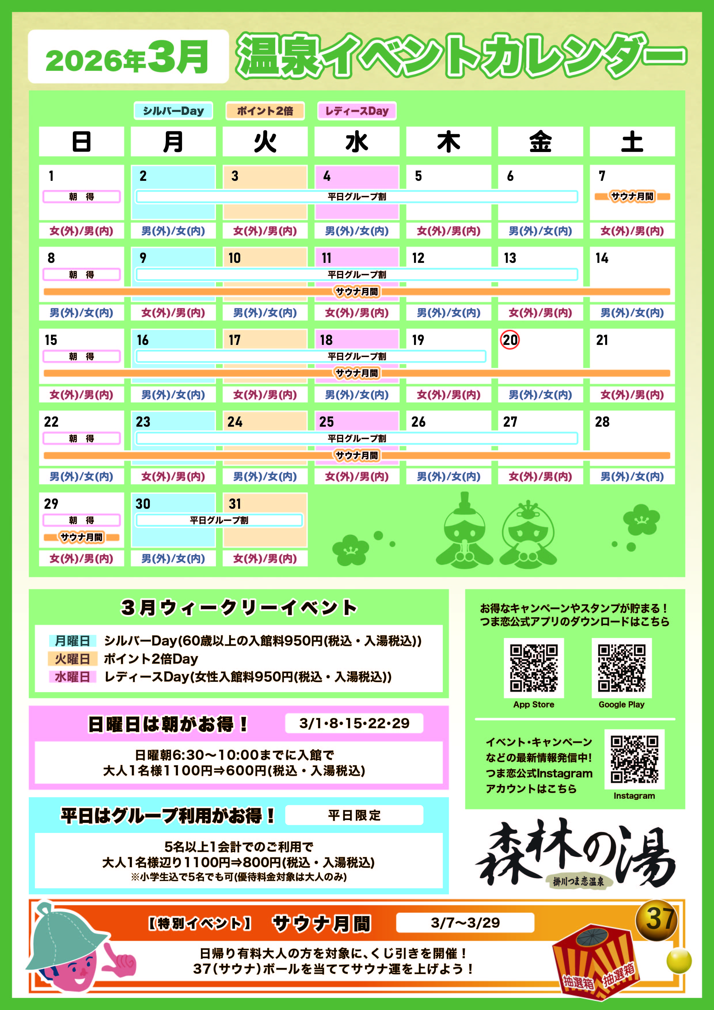 | ※火曜日は森林の湯利用者に発行しています通常1ポイントのポイントカードが2倍となり15ポイントで森林の湯のご招待券1枚プレゼント! | |