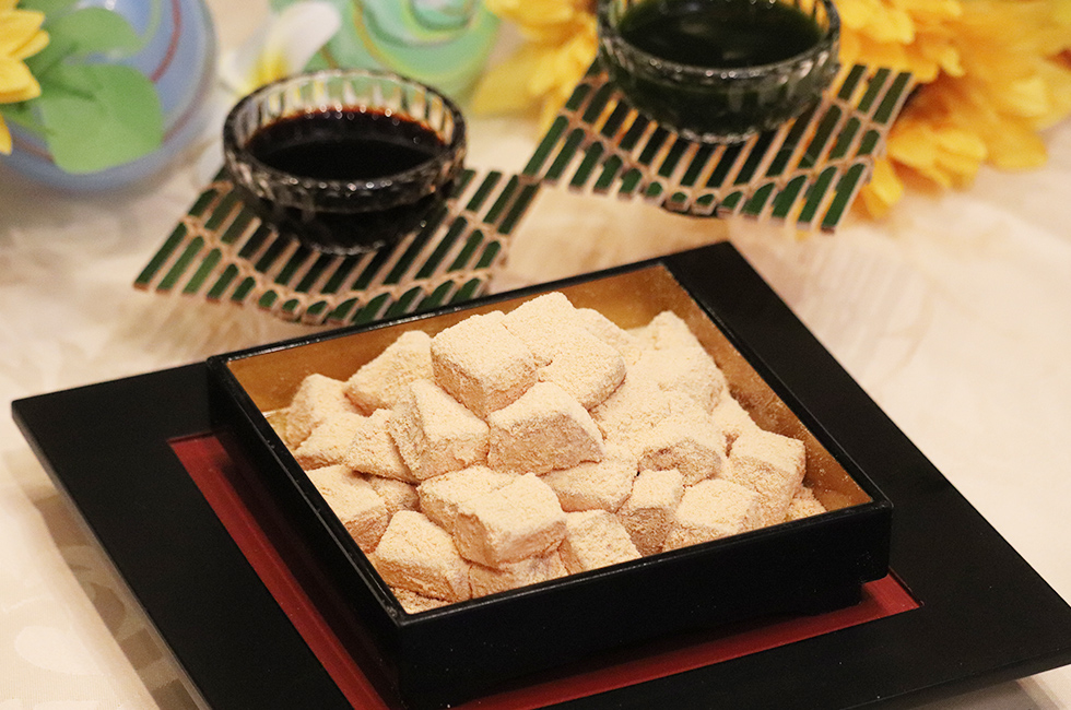 もちっと柔らかい食感に、きな粉の香ばしさが広がる夏祭りには欠かせない甘味。黒糖・抹茶2つの蜜をお好みでかけてお召し上がりください。