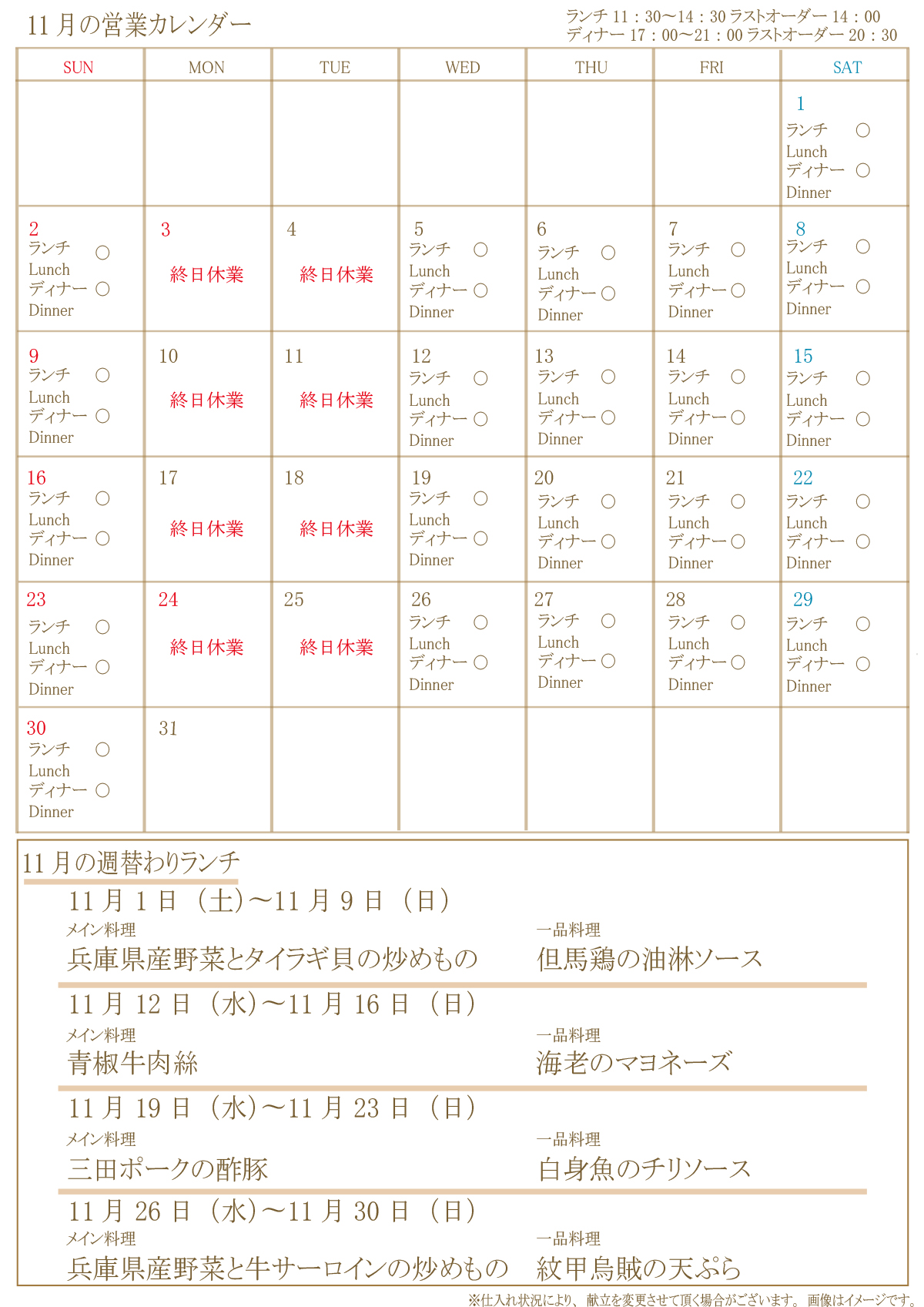 | ディナー | 通常営業 | 臨時休業 | 特別メニュー |