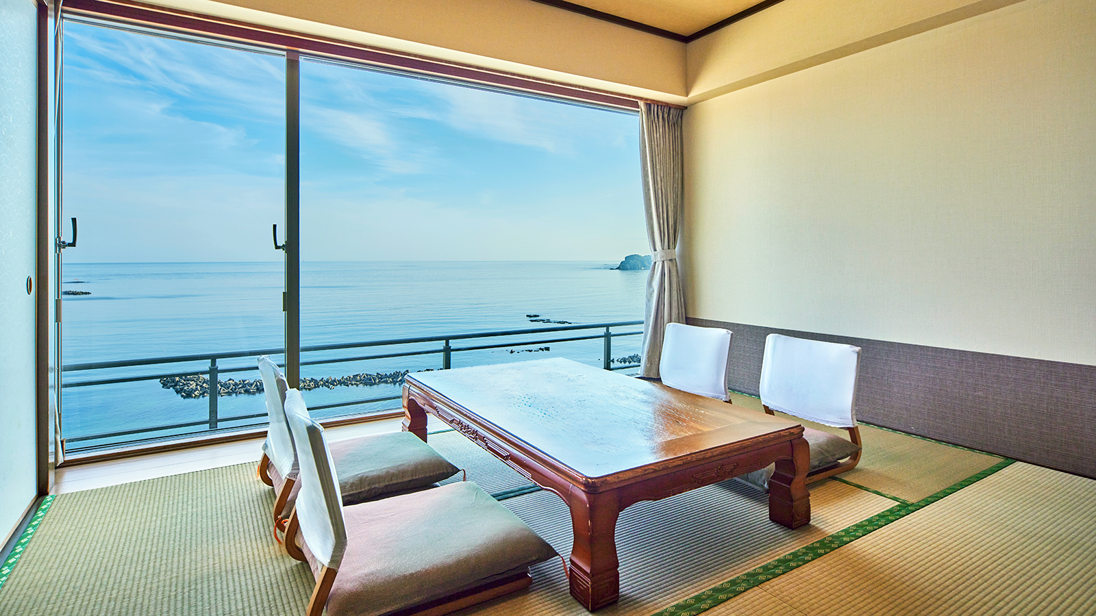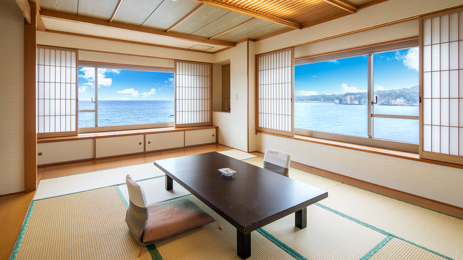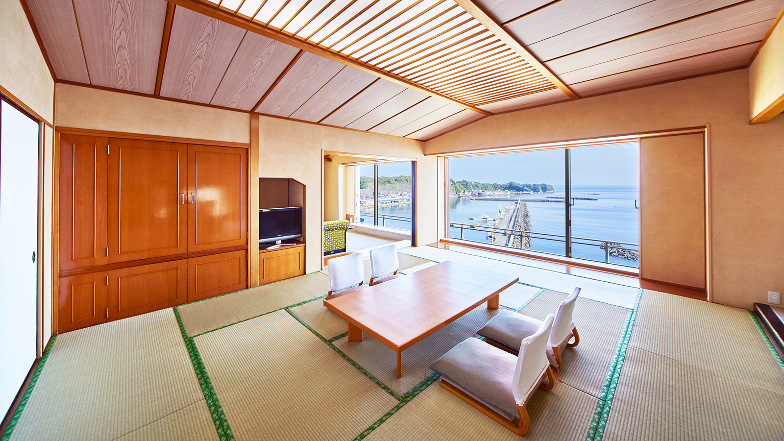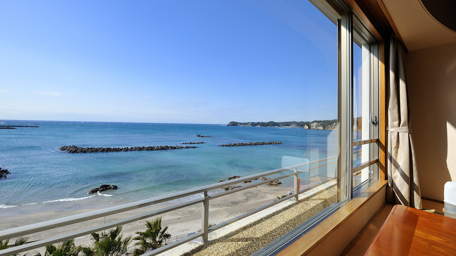お部屋から左に勝浦港、右に白い砂浜、 太平洋と自然のかわりゆく 四季の移ろいを感じていただけます。
