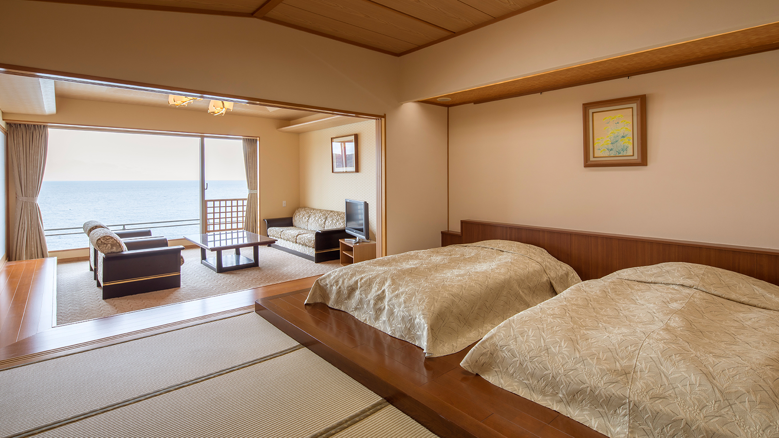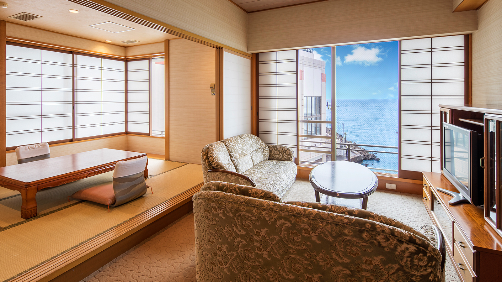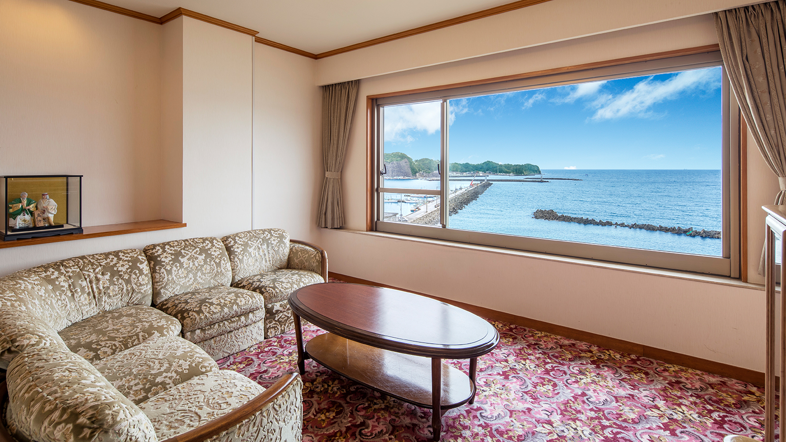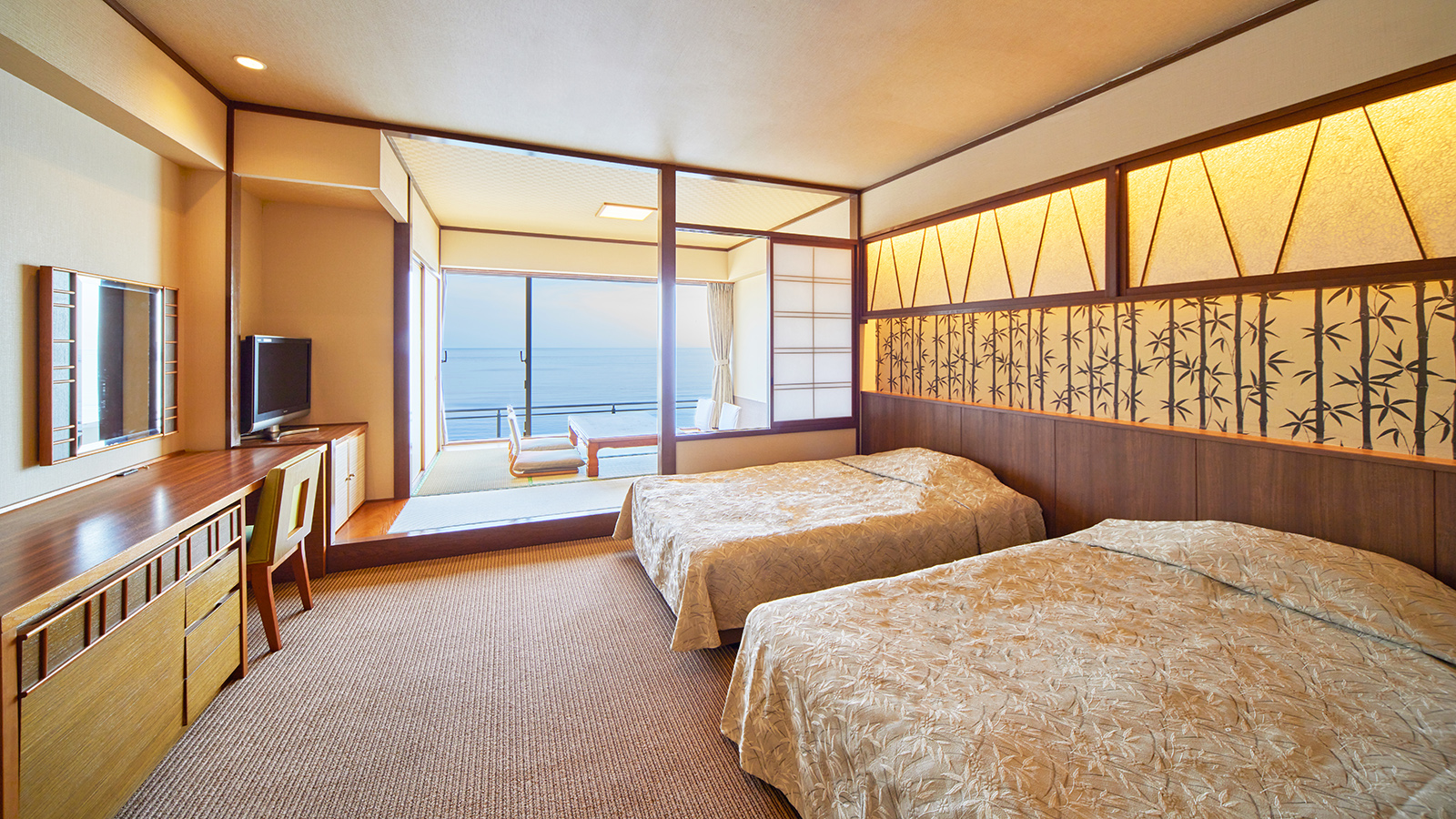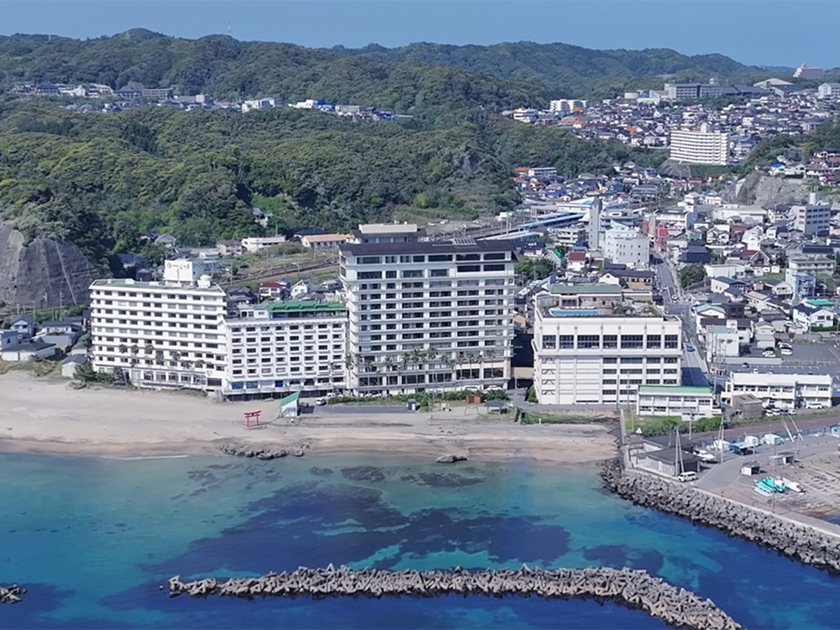 お部屋から左に勝浦港、右に白い砂浜、 太平洋と自然のかわりゆく 四季の移ろいを感じていただけます。