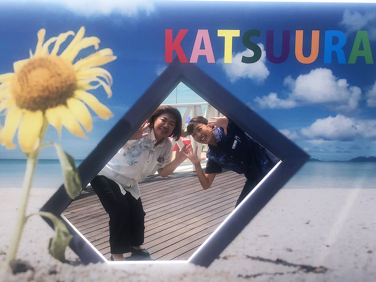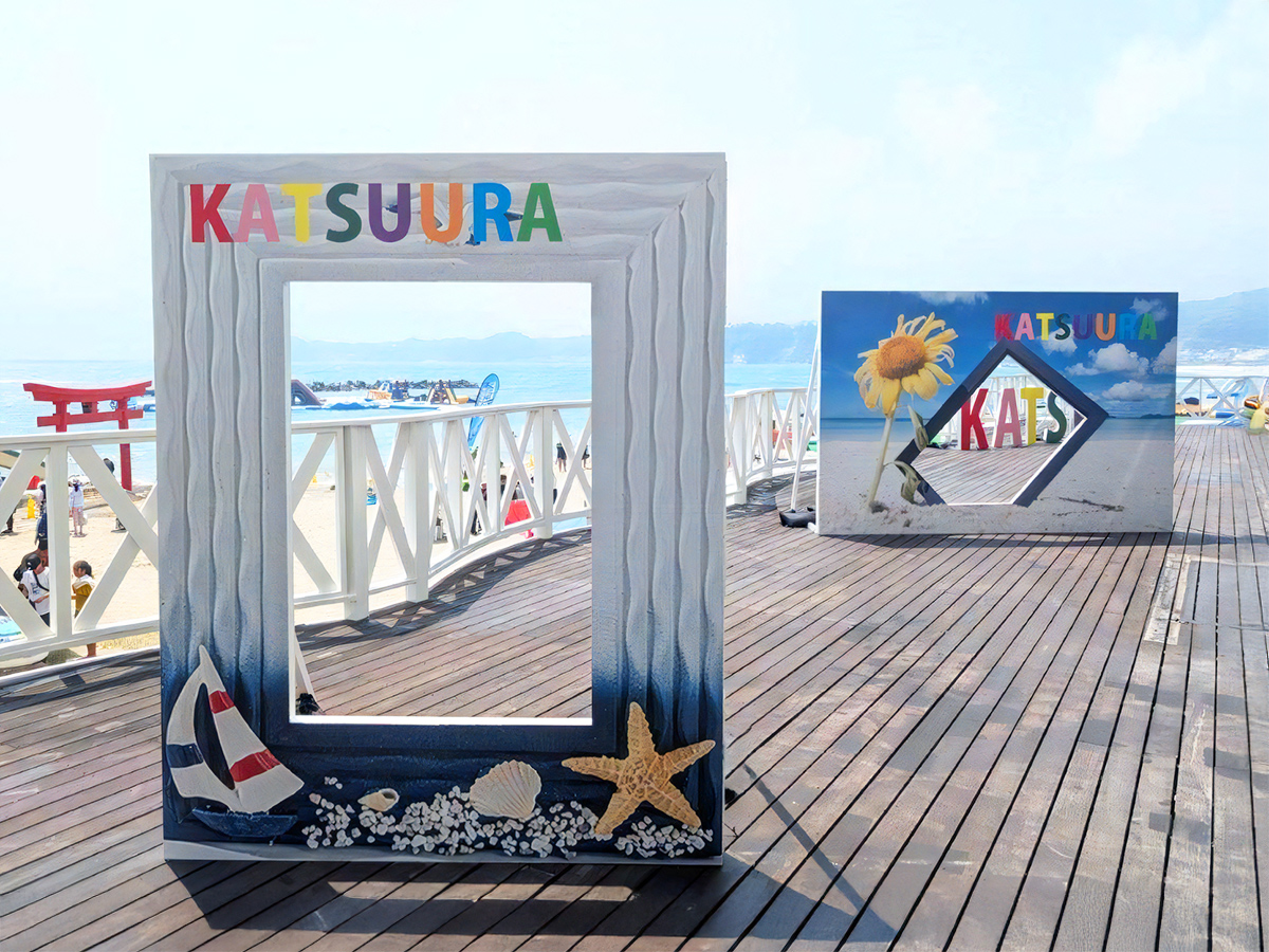 青空と海が広がる風景によく映えるカラフルな「KATSUURA」モニュメントや