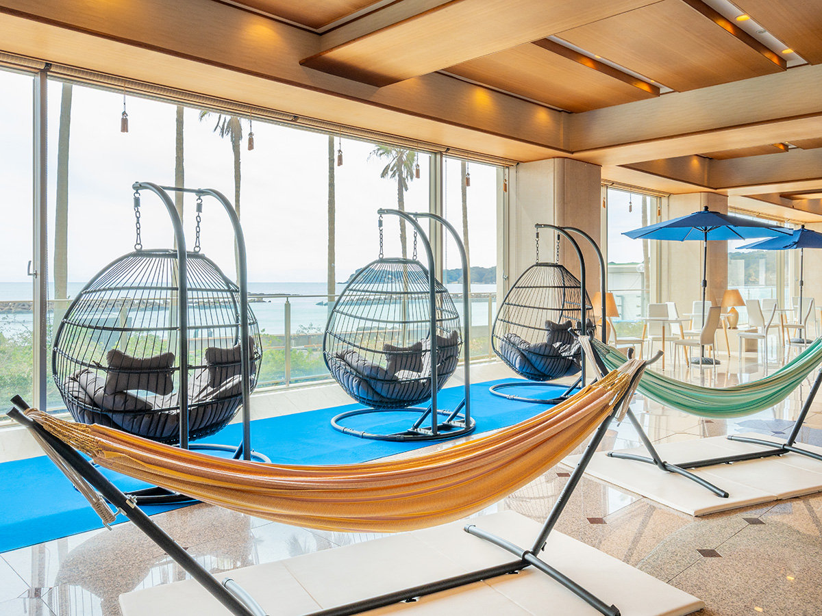 ラウンジにハンギングチェアーとハンモックを設置いたしました。