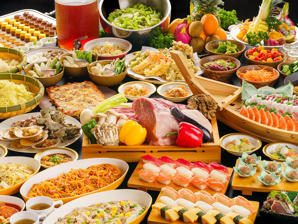 吟味したネタを使った寿司・お刺身・ステーキ・海鮮焼き・天ぷら・デザート等、 和洋中の種類豊富なバイキングをお楽しみください。