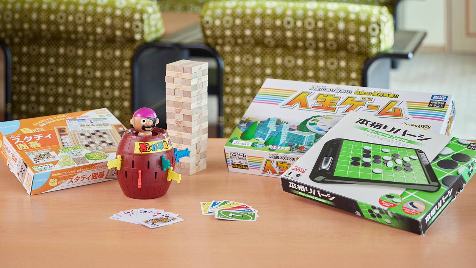 人生ゲーム・黒ひげ危機一髪・ジェンガ・トランプ・UNO・将棋・囲碁・オセロをご用意しております。