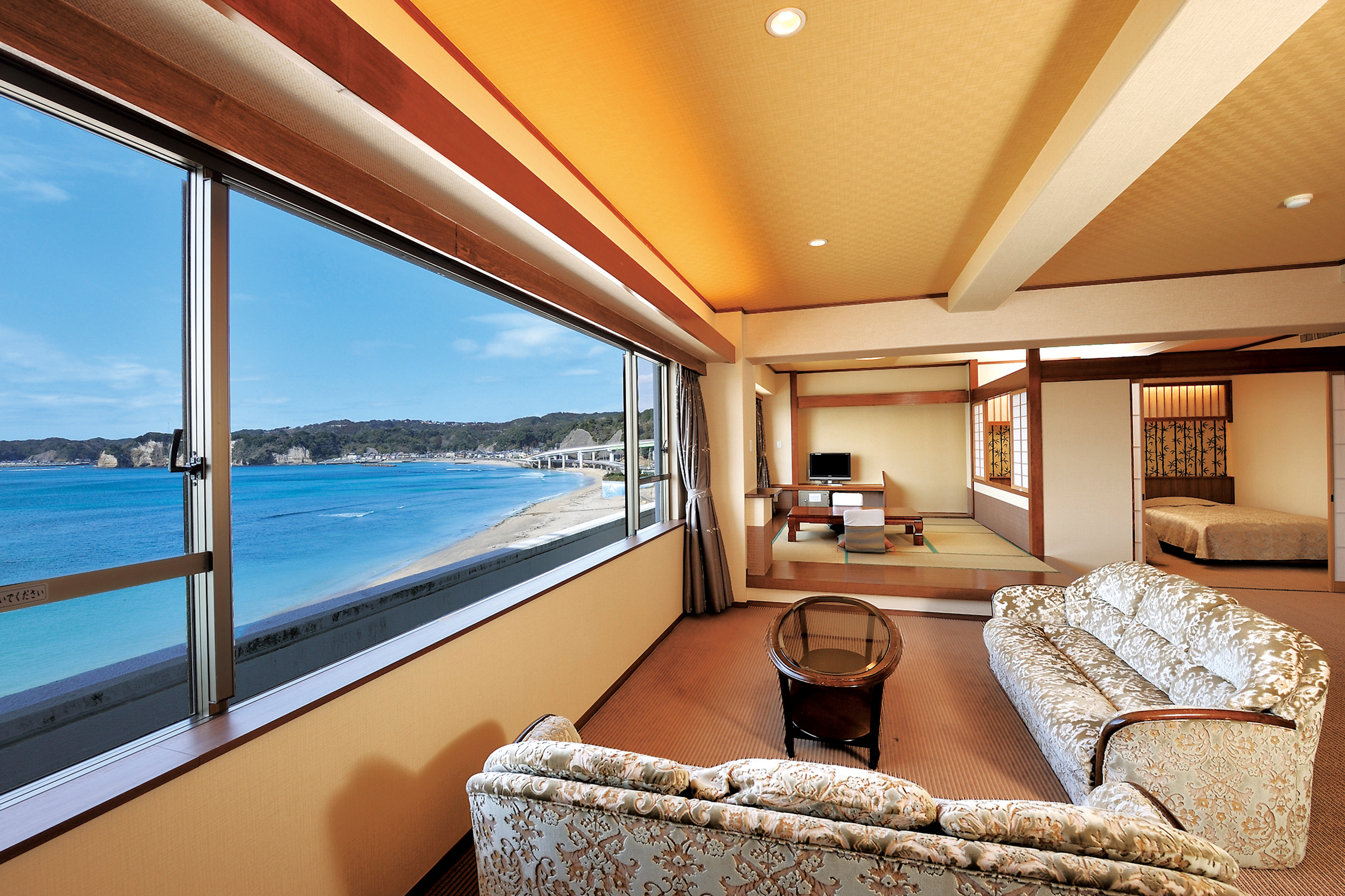 海を見ながらゆったりと寛げる約45㎡の和室とツインベッドが付いた和洋室。和と洋の融合した広々とした空間です。
