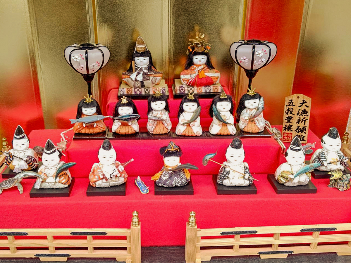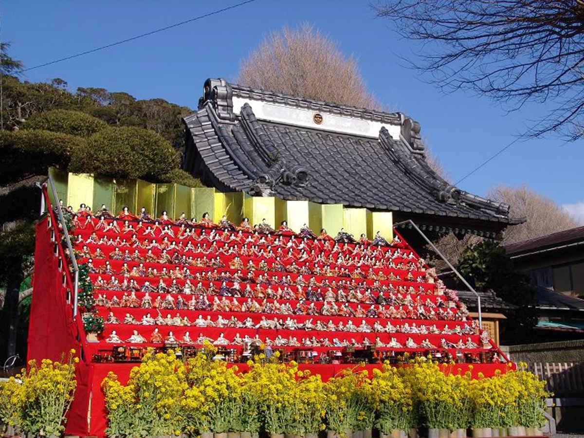 全国から寄贈されたひな形が勝浦市内各所に飾られ、町全体がひな人形一色となります。遠見岬(とみさき)神社の石段60段に飾られた約1800体のひな人形は圧巻の一言です。(雨天時はパネル展示)
