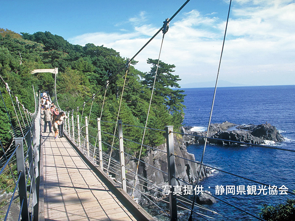 雄大な溶岩岩石海岸です。門脇灯台を中心に全長9kmのハイキングコースがあり、なかでも門脇崎の海の吊り橋はスリル満点です。