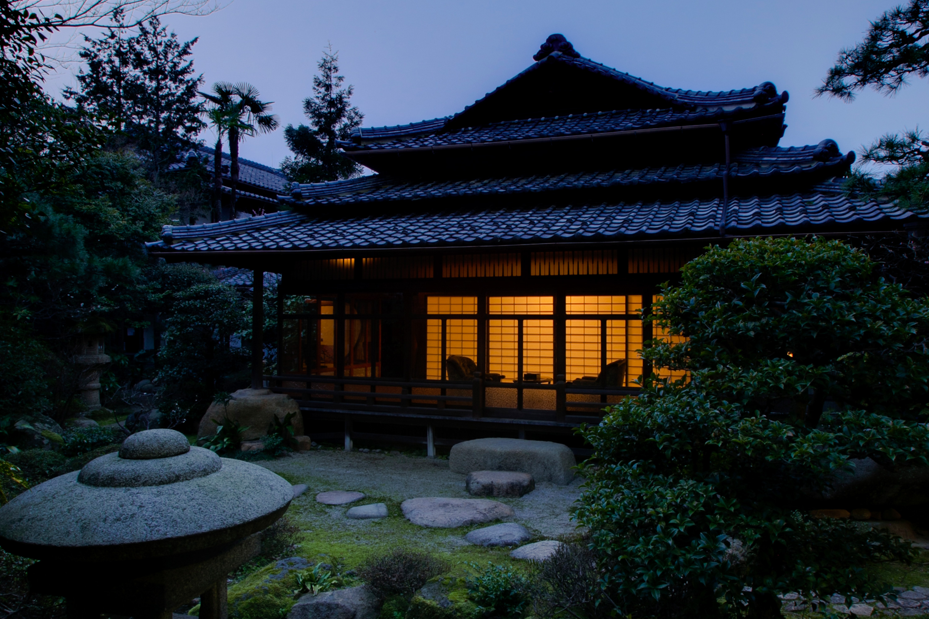 また、入母屋屋根に加えて2 層の庇を延ばした3 枚の屋根が積層する優雅なプロポーションを有し、これは小屋裏に仕込んだ鉄材によって深い軒の出の造りをなし、桟瓦葺でありながら杮葺や*檜皮葺(ひわだぶき)の屋根に通ずる軽やかさを表現しています。