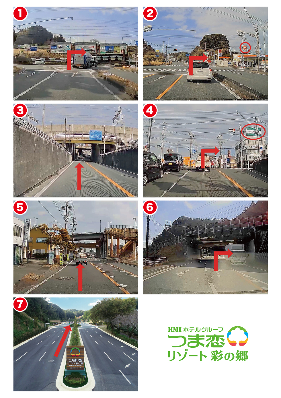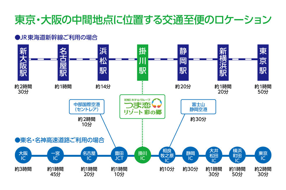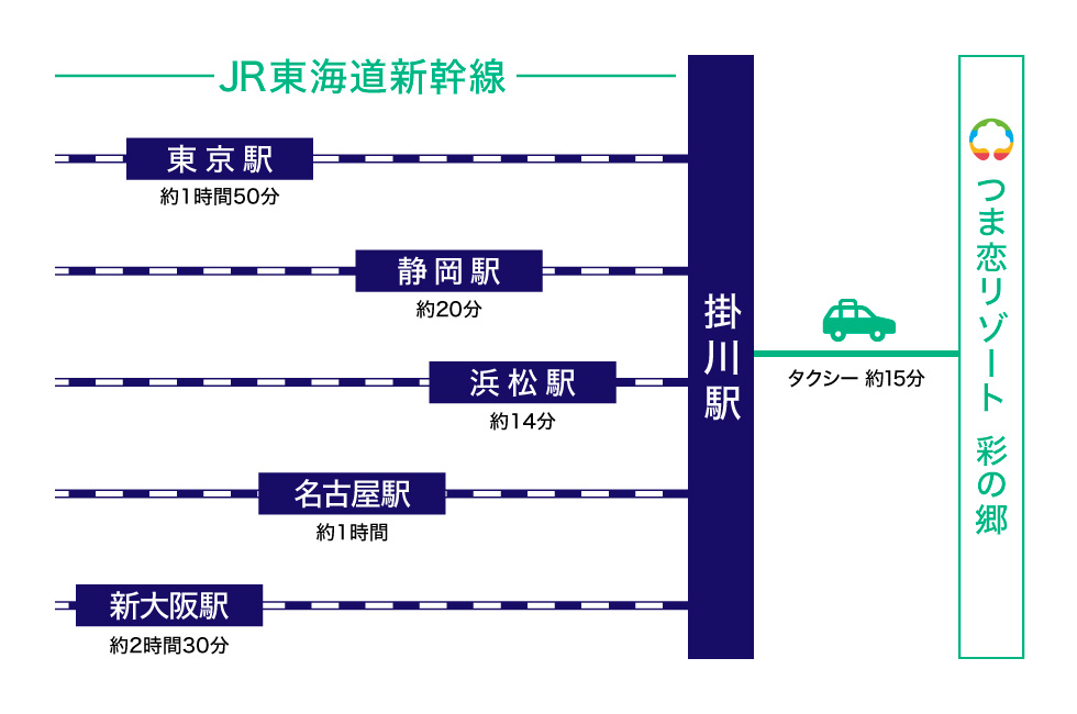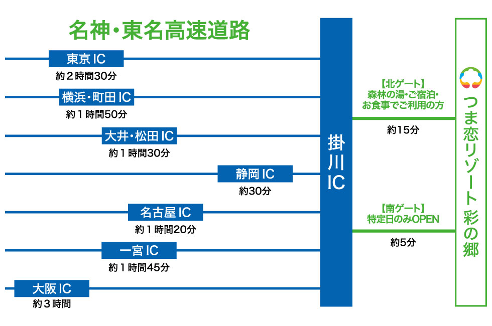 - 新東名高速道路をご利用の場合は新東名島田金谷ICを下りて右折(約3分)、国道一号線バイパス大代ICからバイパスを掛川・浜松方面に向い(約15分)、掛川バイパス千羽ICを下りてつま恋リゾート 彩の郷へ(千羽ICからは下記インターチェンジからのアクセス参照)