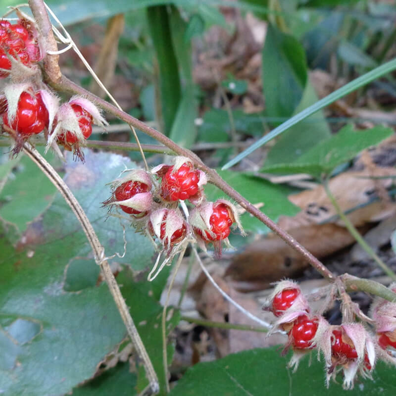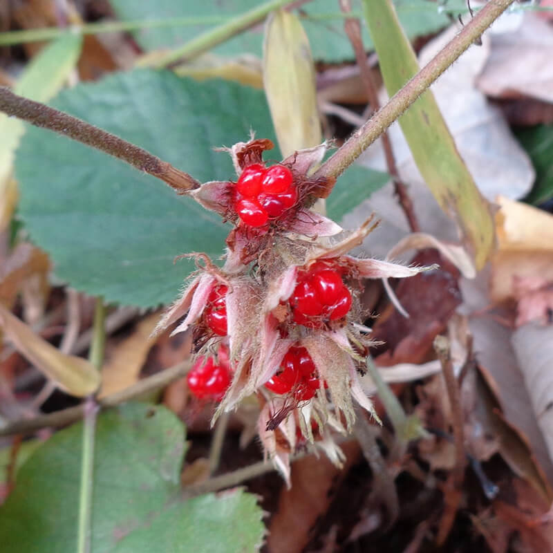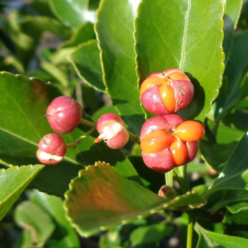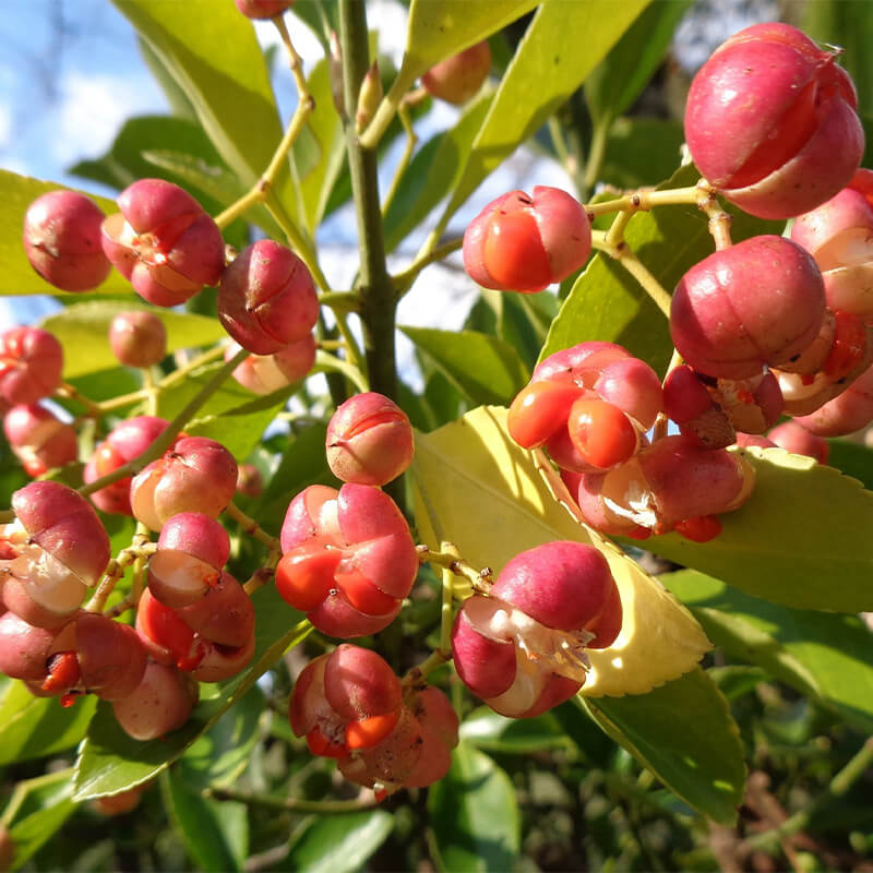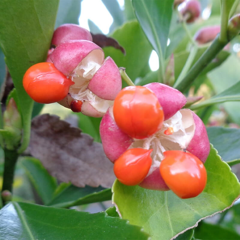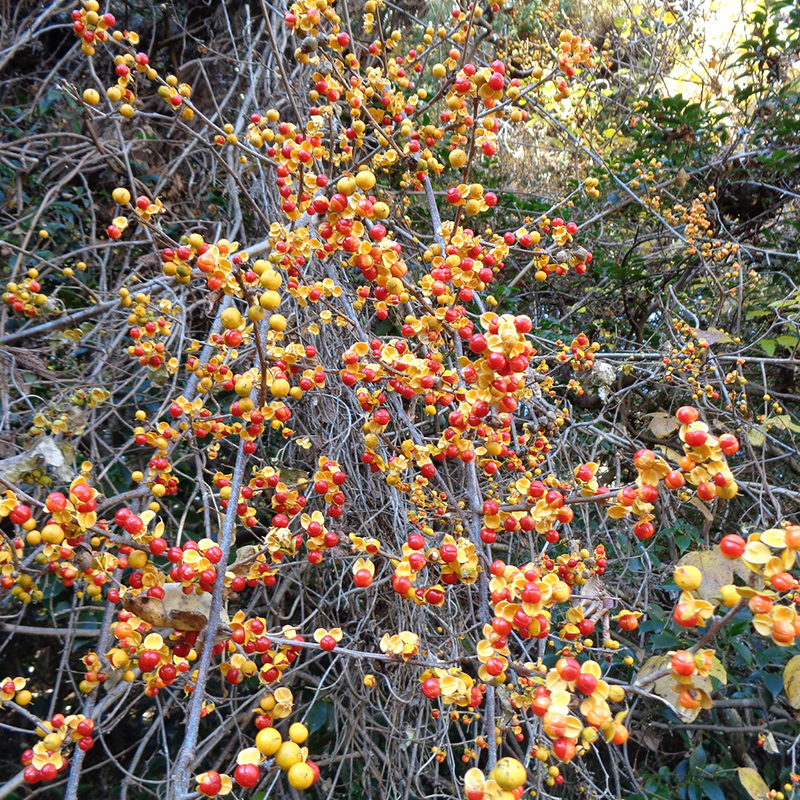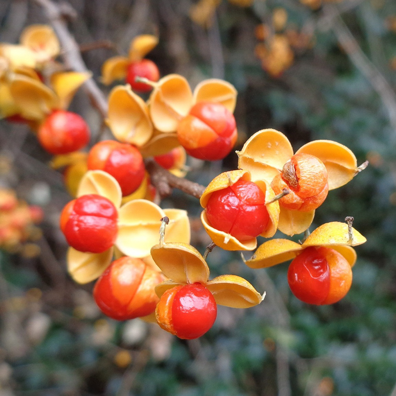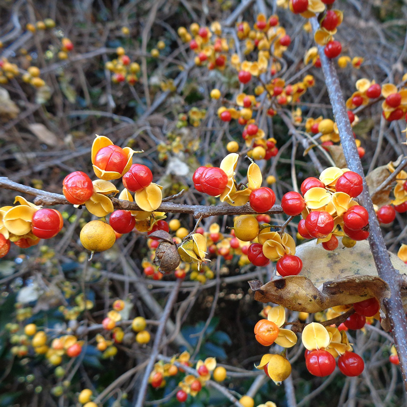 - 黄色く熟した蔓梅擬(ツルウメモドキ)の実が3つに裂けて真っ赤な種子が顔を出しています。鮮やかな色合いで生け花やリースなどによく使われます。葉がウメモドキに似ていて、ツル性であることからこの名になりました。