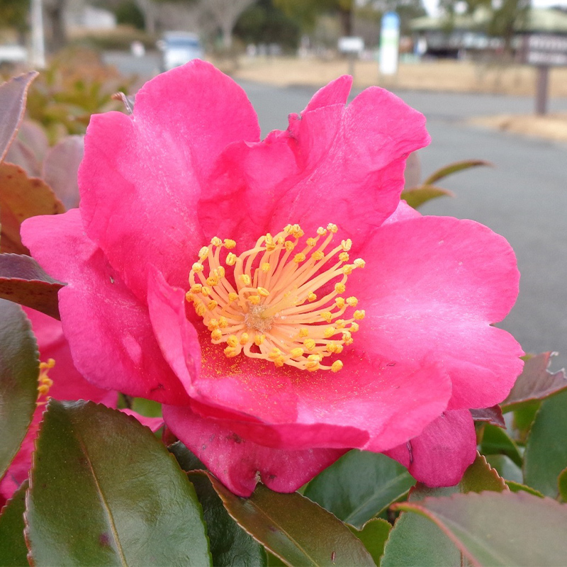 - 山茶花(サザンカ)が園内各所で見頃です。椿(ツバキ)にそっくりな花ですが、椿が花ごと散るのに対して山茶花は花びらが1枚ずつ散るのが特徴です。「さざんか、さざんか咲いた道〜♪」と童謡「たきび」にも登場しています。