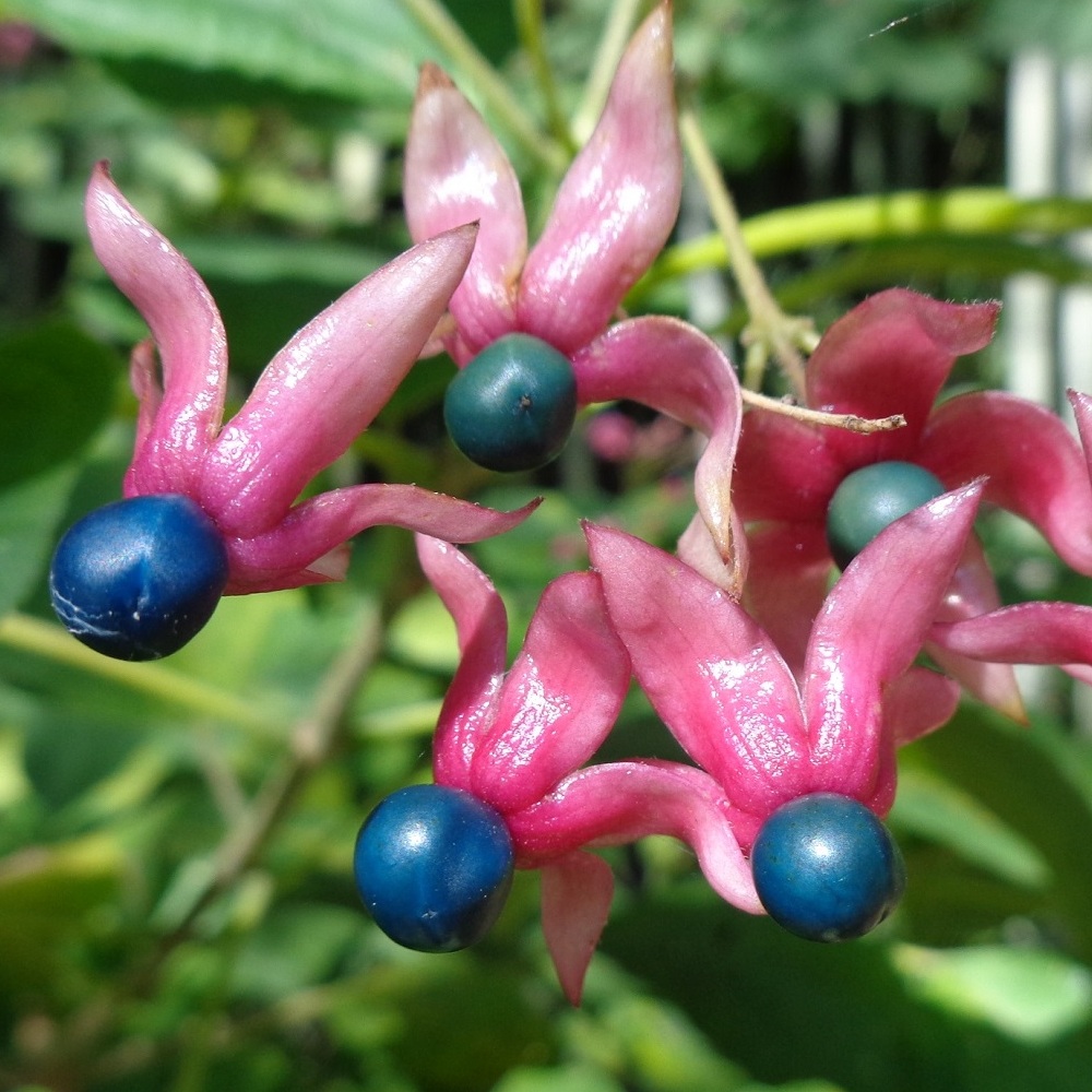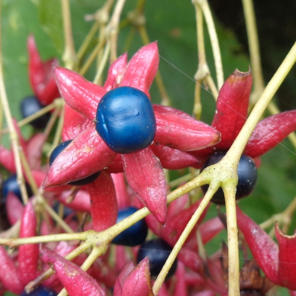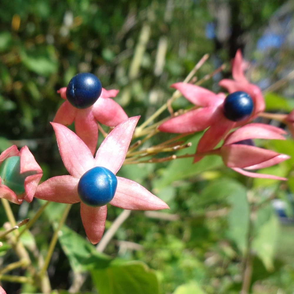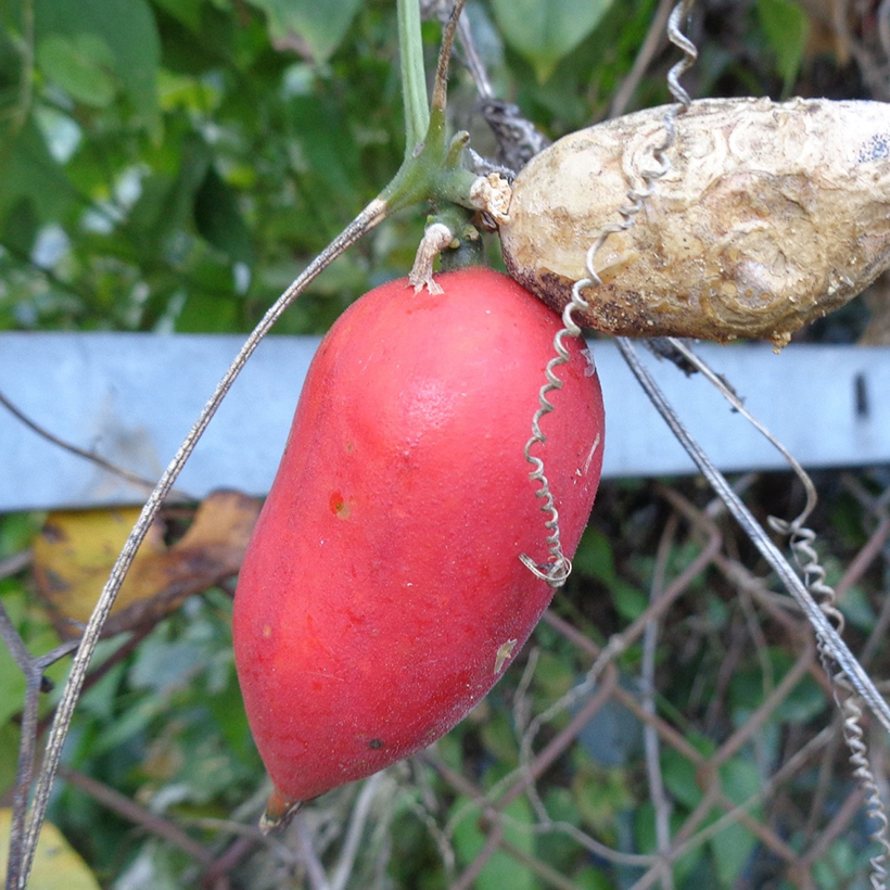 - ①烏瓜(カラスウリ)の実が熟して色々な所にぶら下がっています。種は「打ち出の小槌」や「大黒様の顔」に似ているため、お金を呼ぶ縁起物として知られており、財布の中に入れる人もいるそうです。