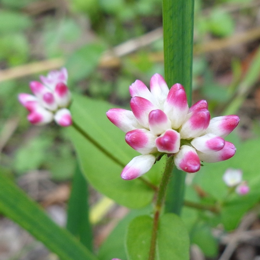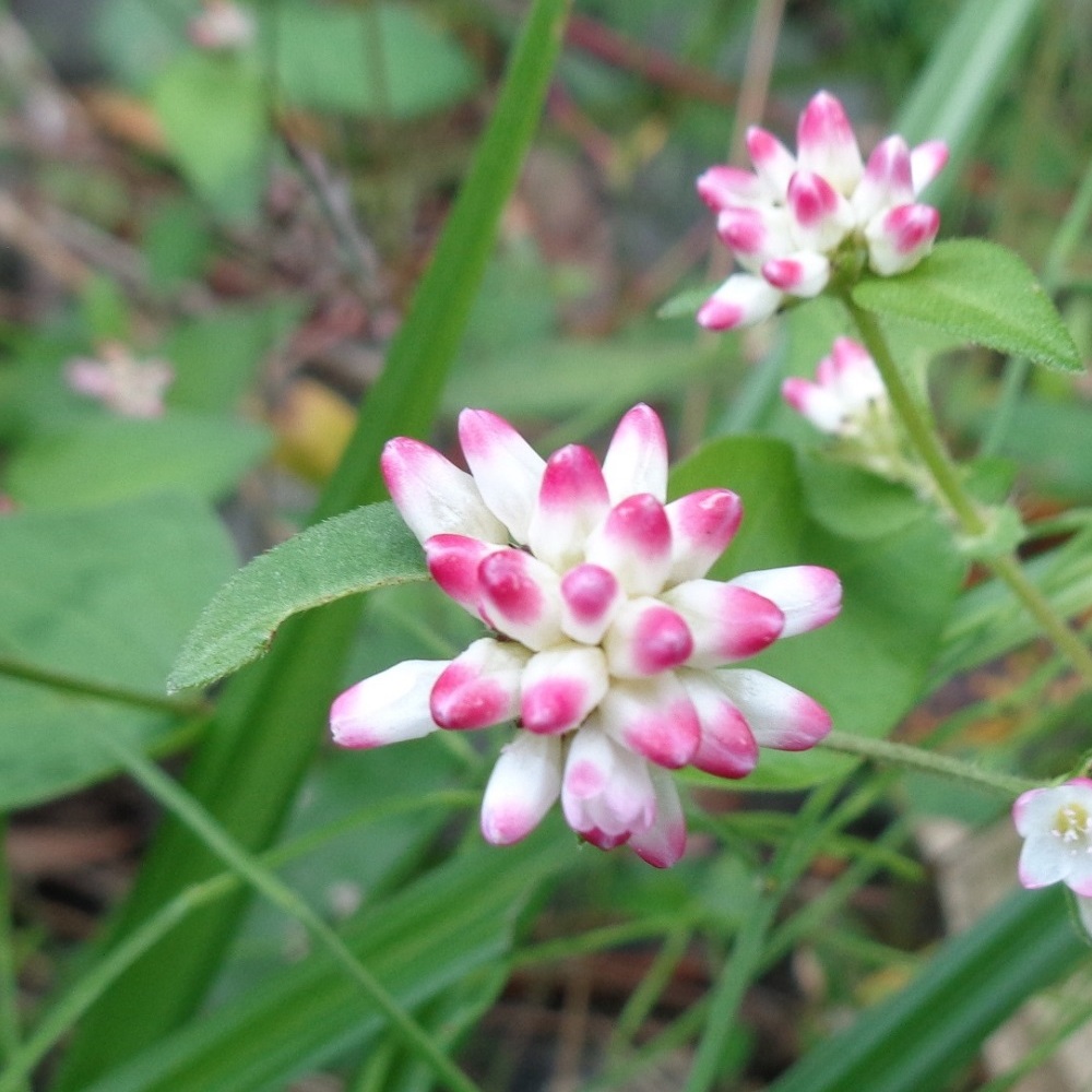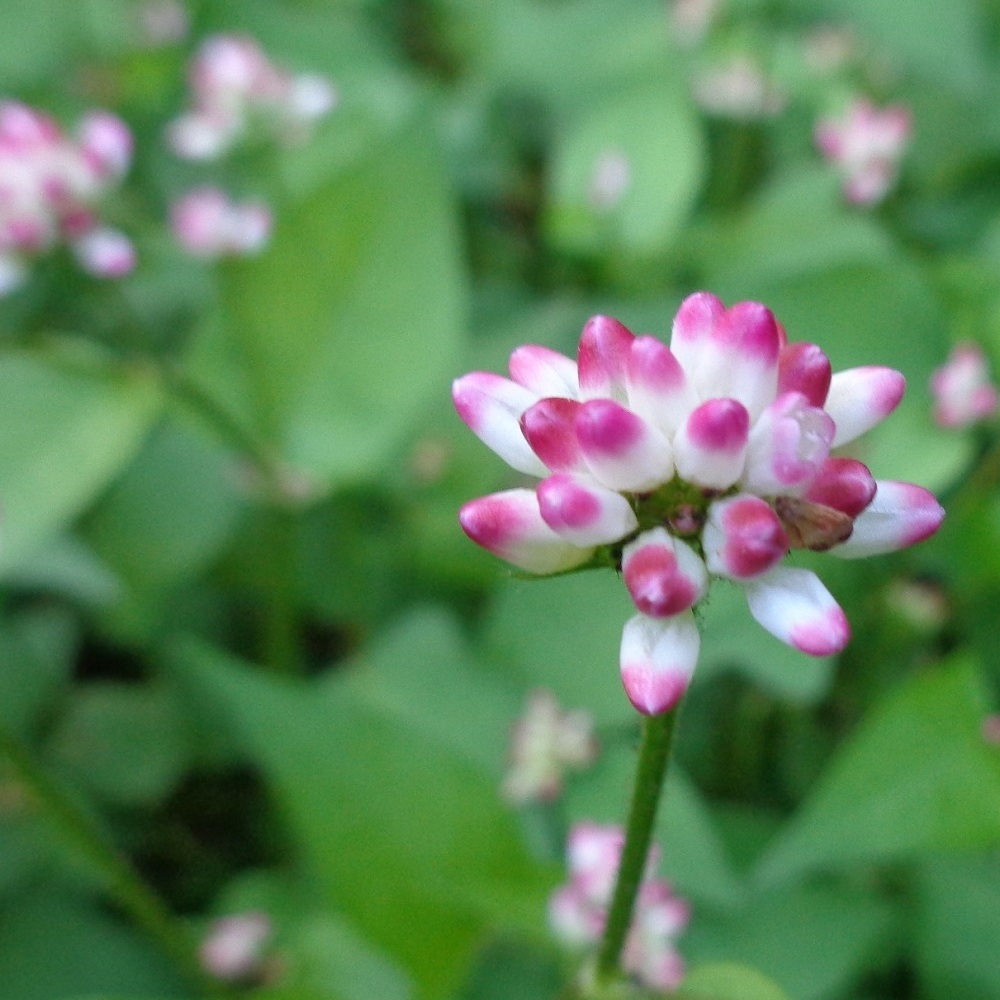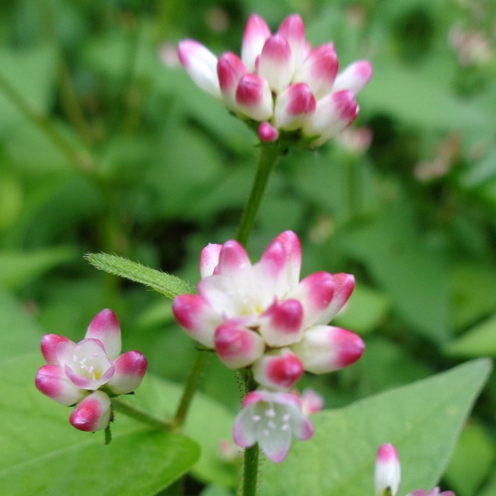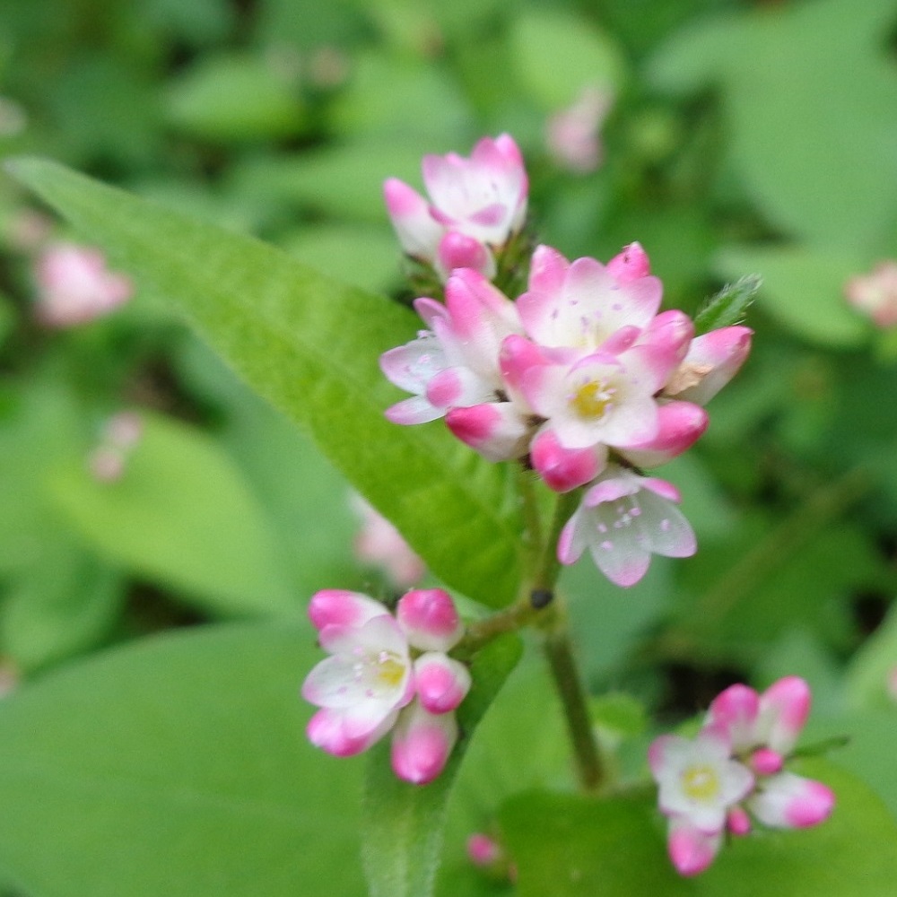 ②溝蕎麦(ミゾソバ)がビオトープに群生しています。枝先にピンク色の可愛い小花を密集させて咲いています。