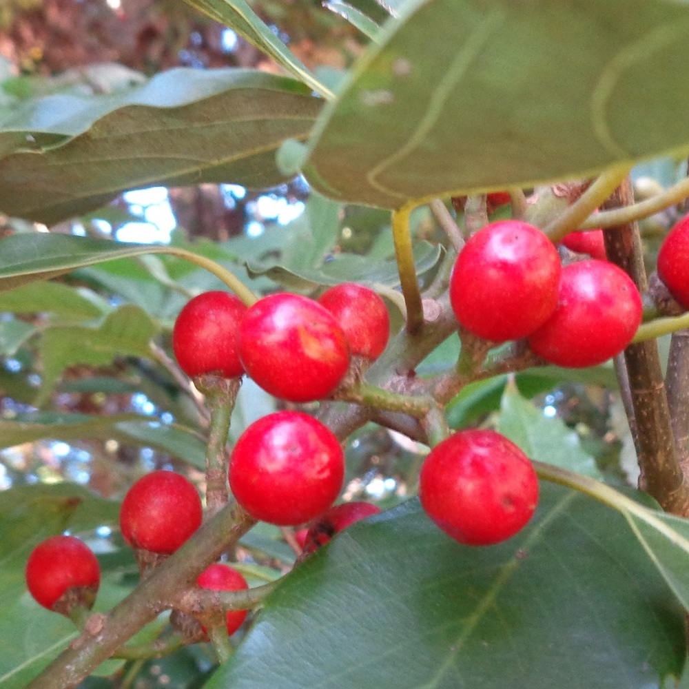 ③白梻(シロダモ)の実が色づきました。もう少しすると花も咲き、実と花を同時に見ることができる不思議な木です。