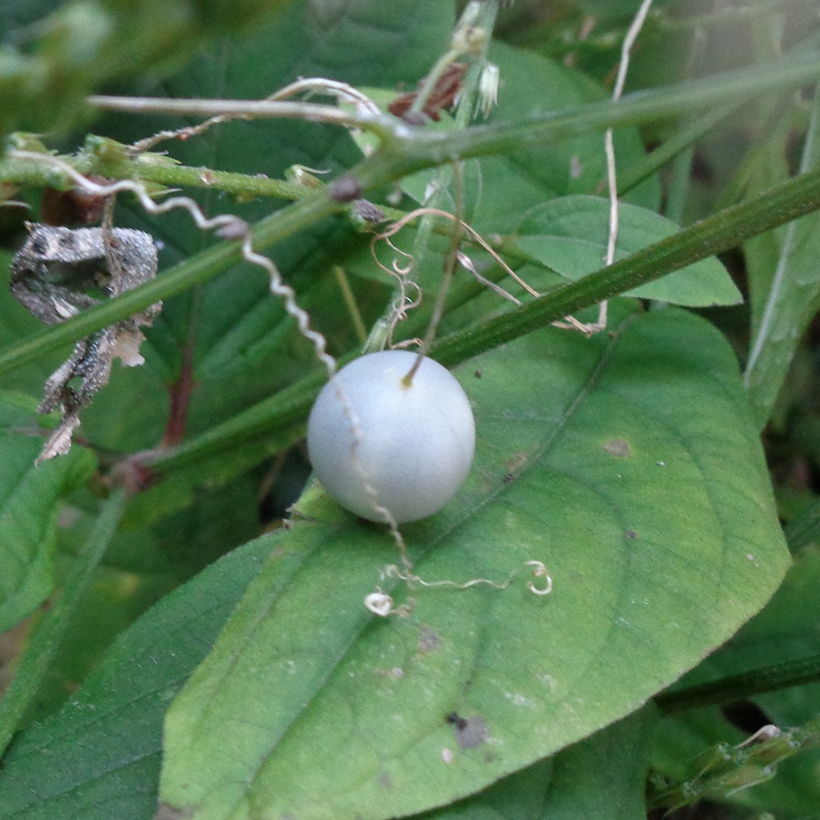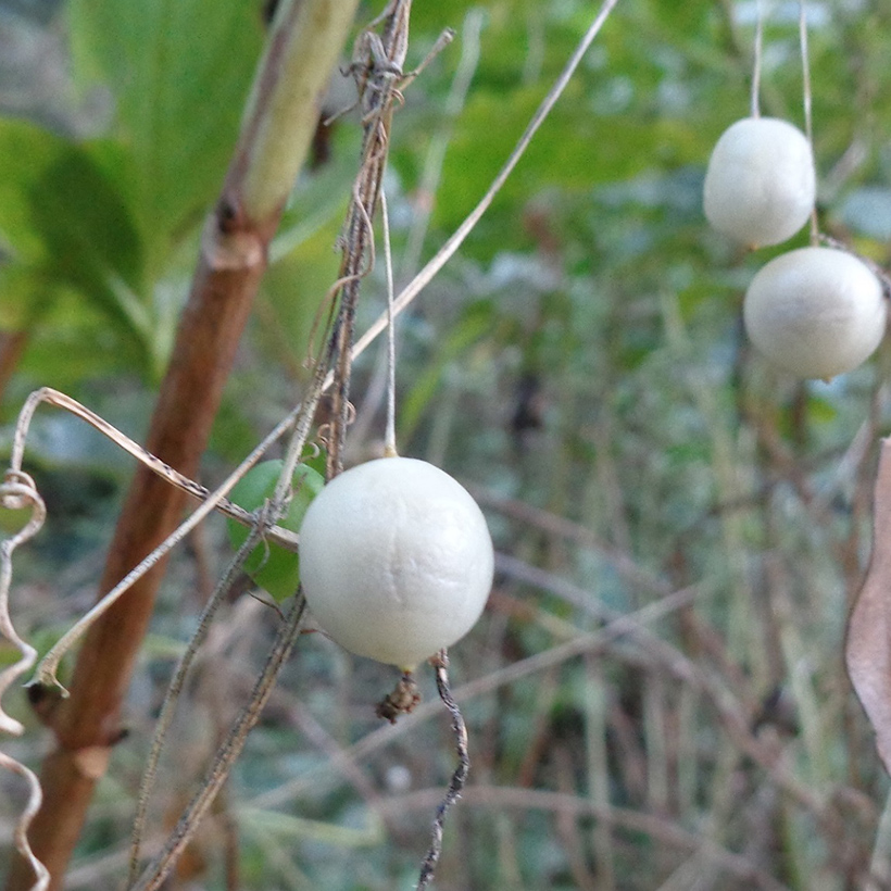 ②雀瓜(スズメウリ)の実がたくさんぶら下がっています。直径1〜2cmの球形で熟すと灰白色になります。