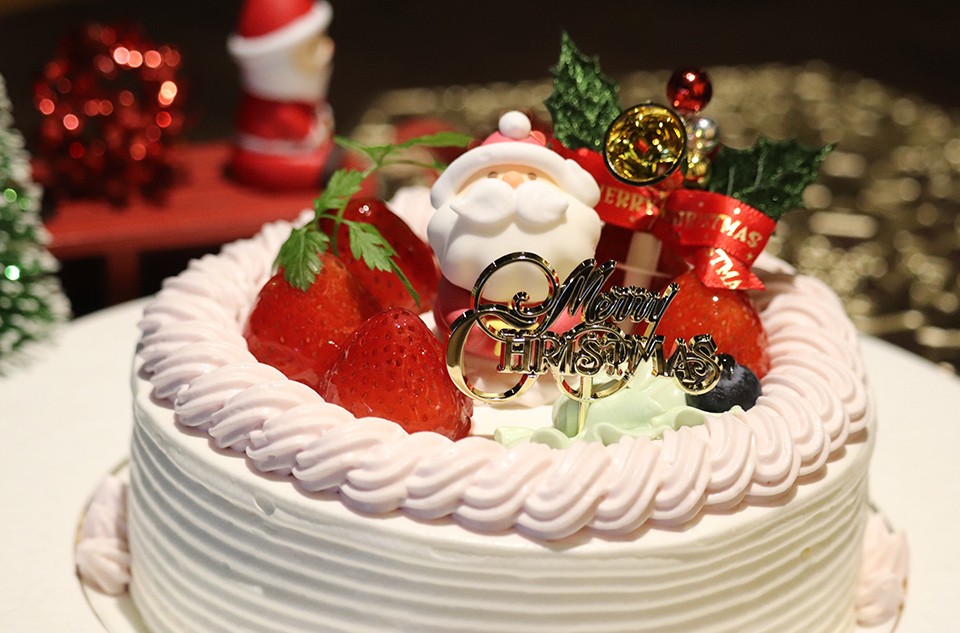 イチゴとピンク色のクリームが彩るクリスマスケーキ。ふんわり焼き上げたスポンジに優しい甘さのクリームを重ね、サンタと柊が聖夜のテーブルを華やかに演出します。