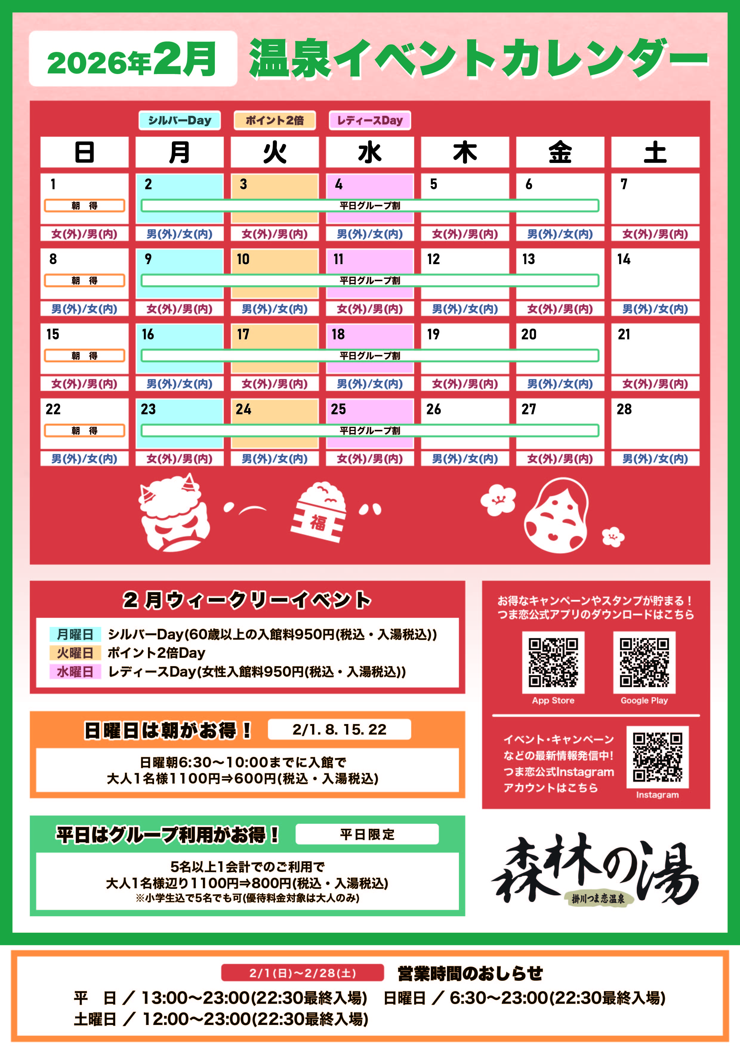 | ※火曜日は森林の湯利用者に発行しています通常1ポイントのポイントカードが2倍となり15ポイントで森林の湯のご招待券1枚プレゼント! | |